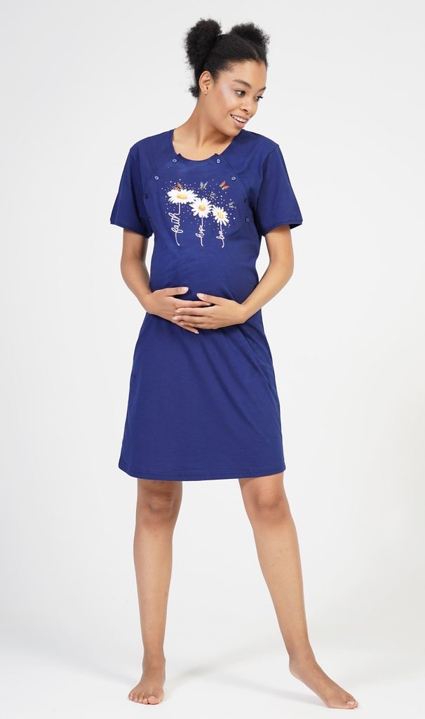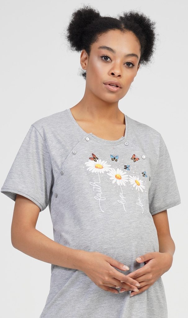 Dámská noční košile mateřská Kopretiny. Dámská noční košile mateřská je svým střihem určená na dobu těhotenství, do porodnice i ke kojení. Ke kojení slouží průstřihy po stranách košile, které jsou uzavíratelné na knoflíky. Na hrudníku jsou vyobrazeny tři kopretinky, jejich nožičky tvoří nápisy Faith - Hope - Love. Použitý materiál je jemný a poddajný na dotek. Košile je vhodná na denní nošení.