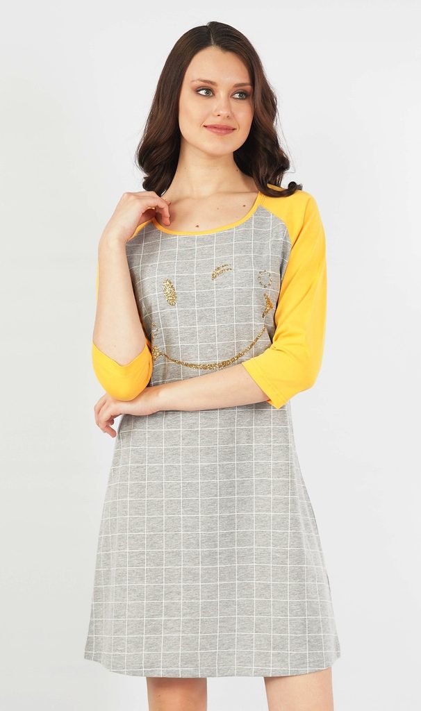 Dámská noční košile s tříčtvrtečním rukávem Úsměv. Zajímavá a výrazná noční košile má pohledově barevně odlišené rukávy. Na hrudi je zlatý obrázek rozesmátého smajlíka na kostkovaném podkladu. Použitý materiál je jemný a poddajný na dotek. Košile je vhodná i na denní nošení.