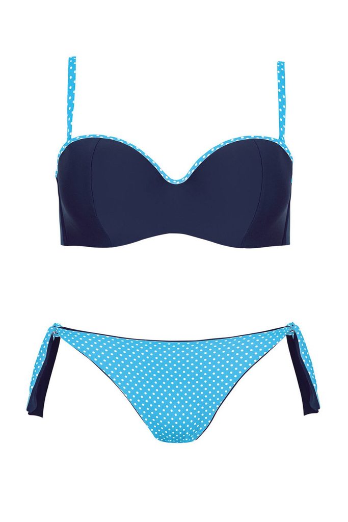 Dámské dvoudílné plavky 730 w v16 Self - horní díl má tmavě modrou barvu se světle modrými detaily - nastavitelná, odnímatelná ramínka - košíčky jsou vyztužené kosticemi - horní díl plavek a ramínka jsou světle modrá s bílými puntíky - spodní díl plavek má klasický kalhotkový střih - spodní díl je světle modrý s bílými puntíky a tmavě modrými detaily - plavky jsou vyrobené z příjemného, pružného a rychleschnoucího materiálu