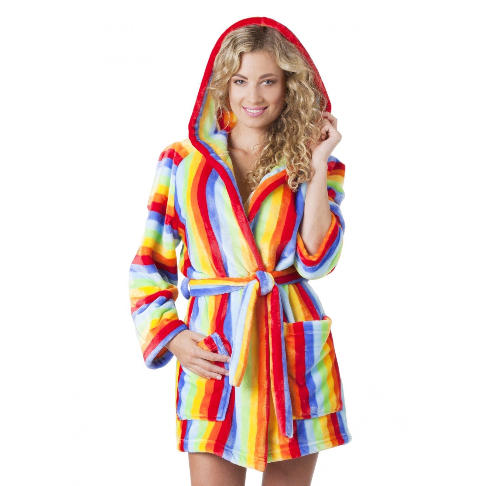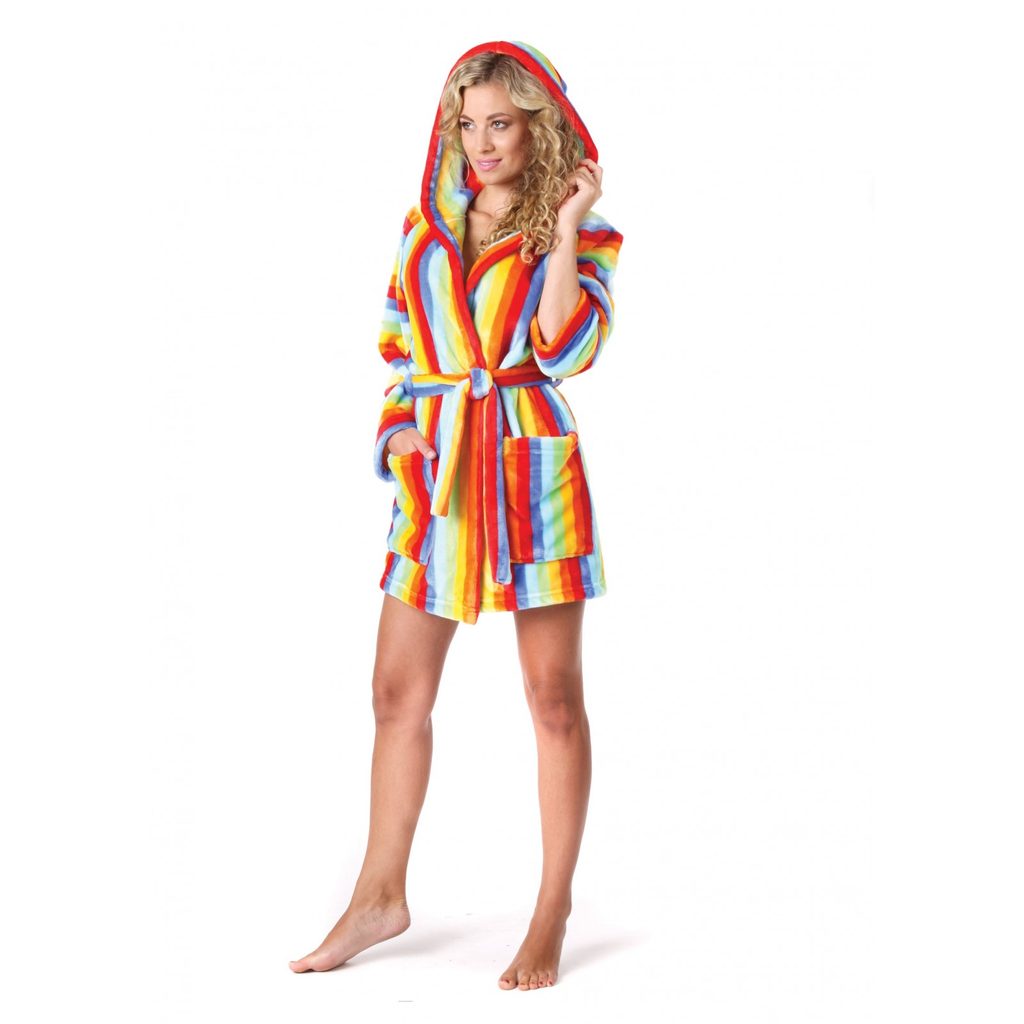 Pruhovaný dámský 3/4 župan v pestrých duhových barvách. Župan má delší střih s páskem na zavazování v pase. Má dvě větší praktické kapsy a kapuci pro ještě větší pohodlí. Župan je kvalitně zpracován a má lehký, měkký materiál s krátkým hustým vlasem. Působí hravým, mladistvým dojmem. V naší nabídce je k dispozici i v krátkém nebo dětském provedení.