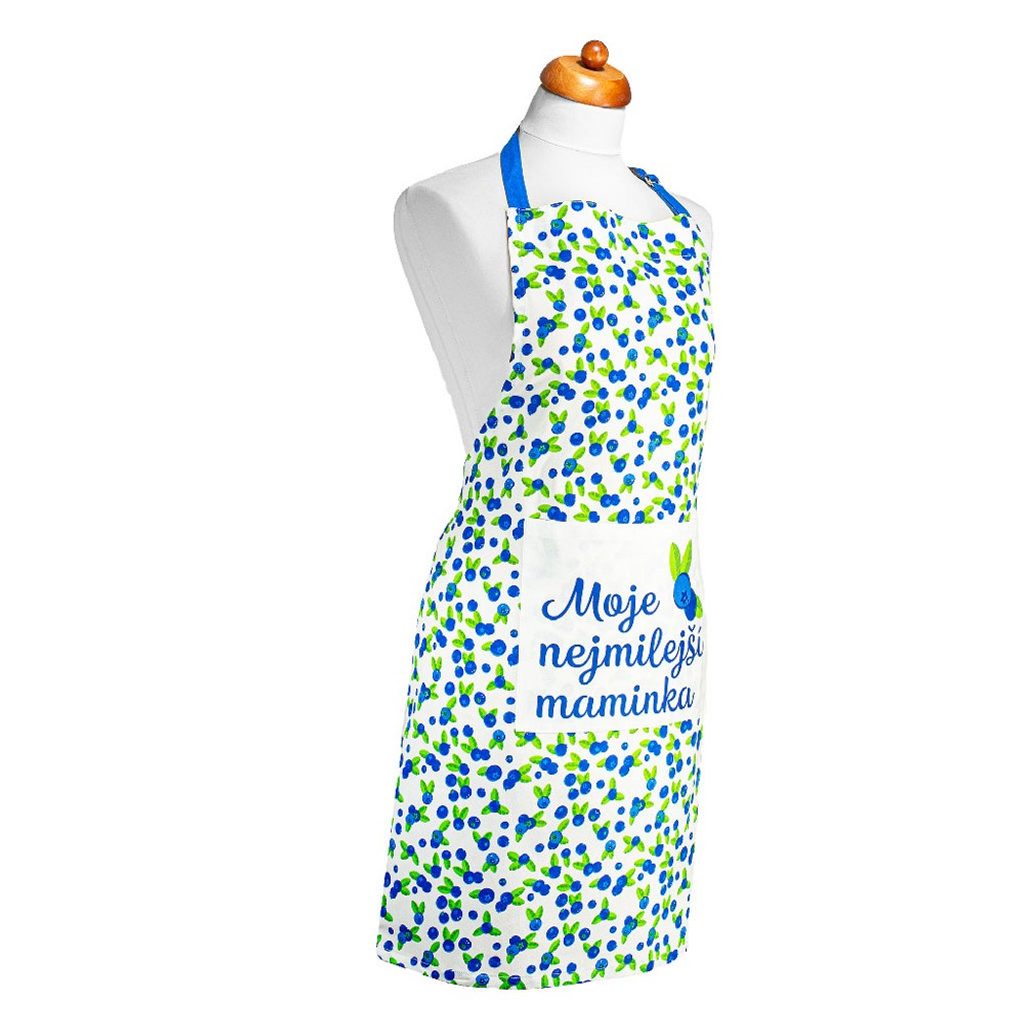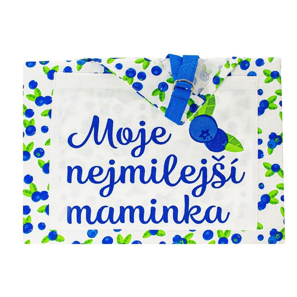 Kuchyňský set s nápisem "Moje nejmilejší maminka" obsahující zástěru, chňapku a dvě utěrky s motivem borůvek - ideální dárek pro Vaši maminku.