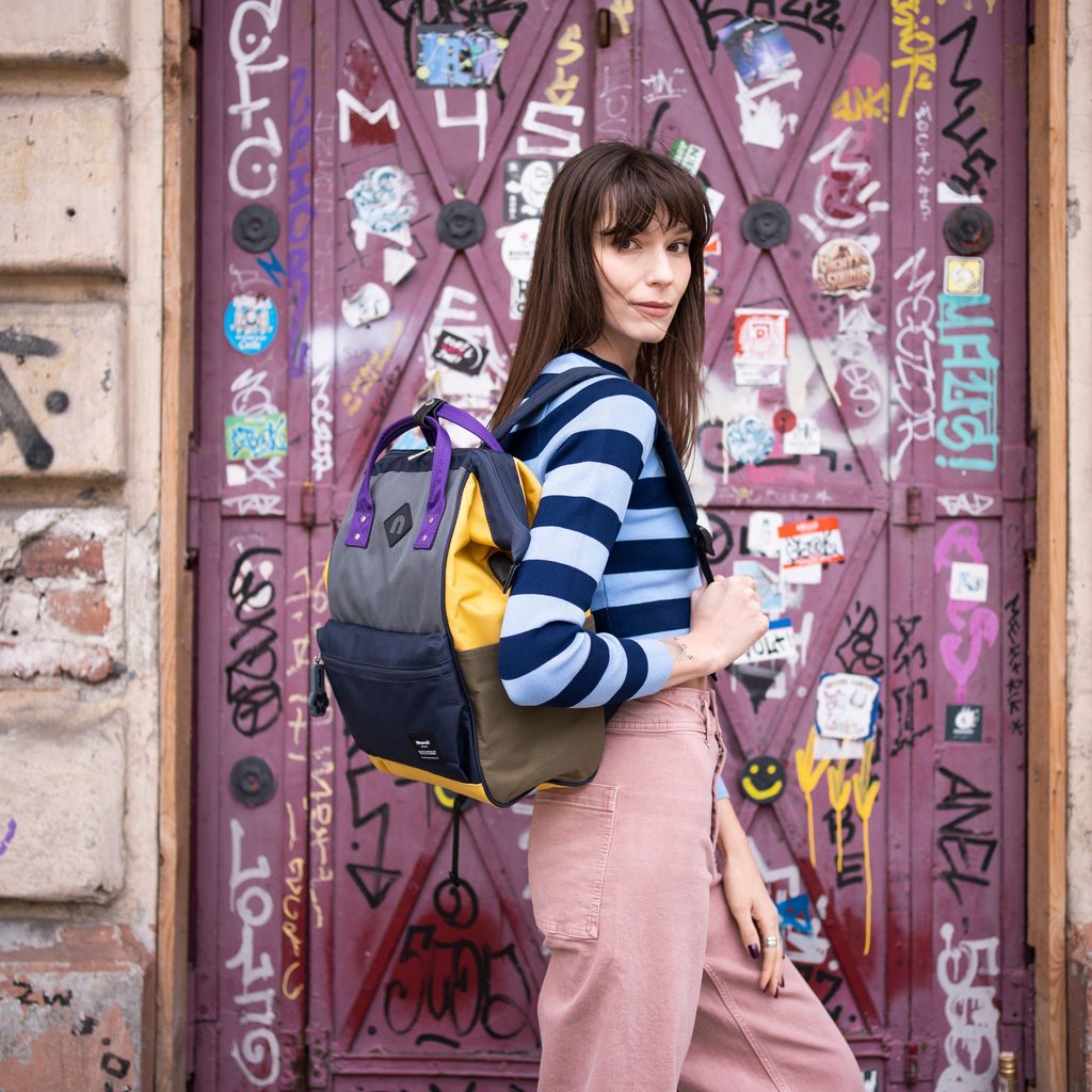 Výrobek značky Himawari. Každodenní batoh s výjimečným designem. Obsahuje mnoho kapsiček a přihrádek, díky čemuž je velmi funkcionální. Posílený lehkou výztuží, díky čemuž se dobře otevírá a zavírá. Osvědčí se v každodenních městských stylizacích.
