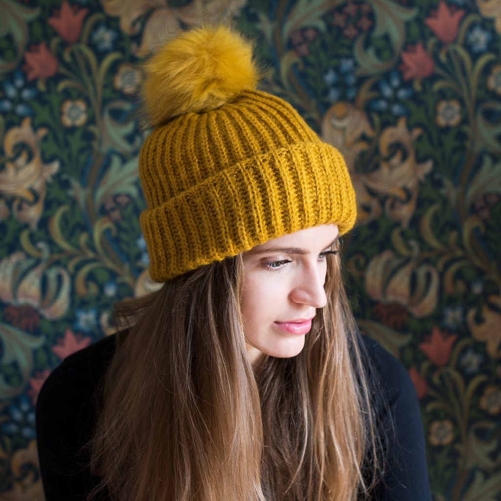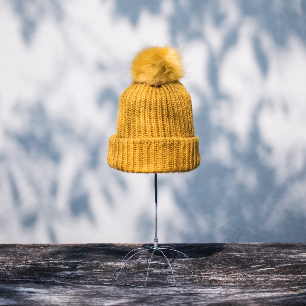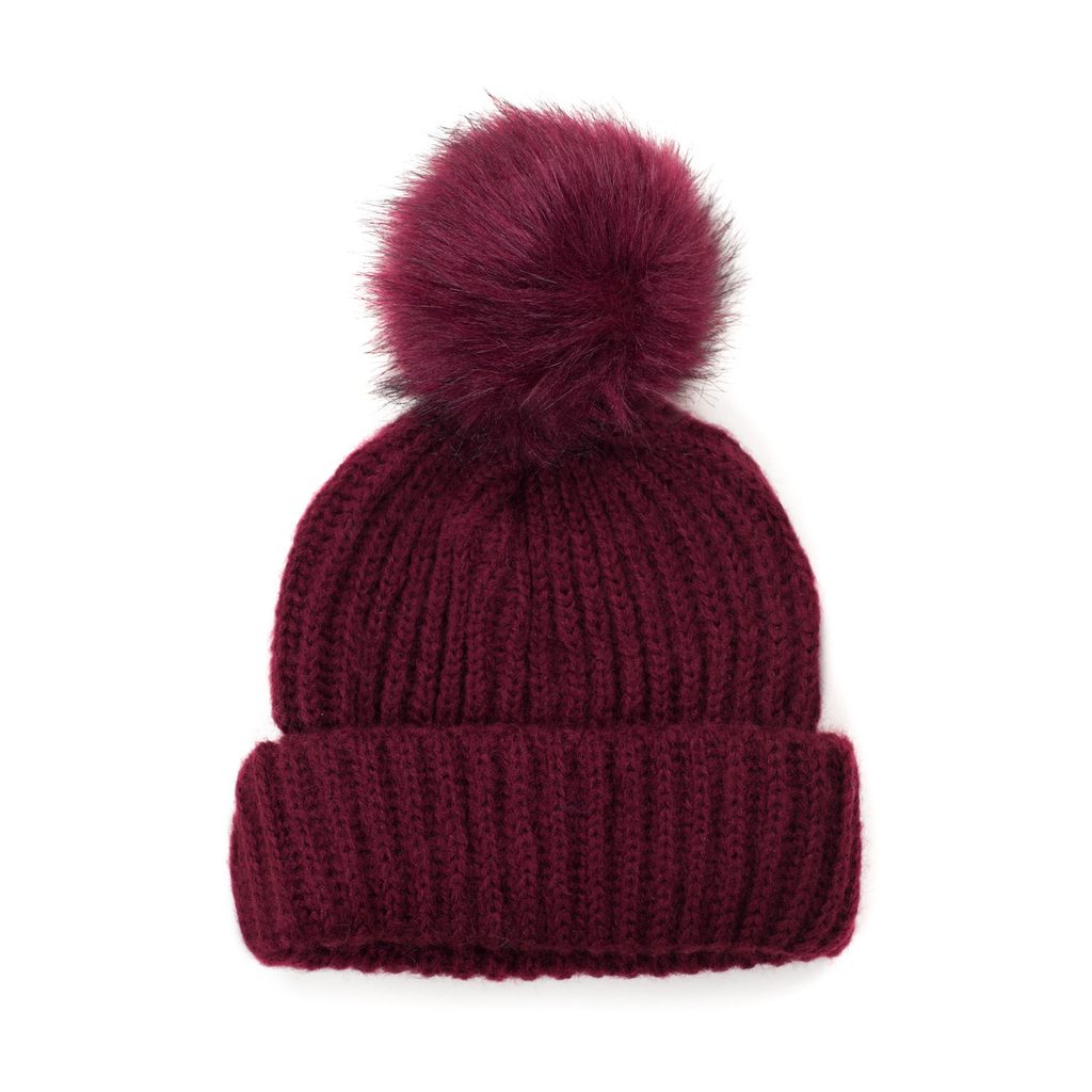 Zimní čepice s bambulí. Bambule provedená z umělé kožešiny. Spodní část na zahnutí. Vejdou se do ní sepnuté vlasy. Ideální ke sportovním i neformálním stylizacím.