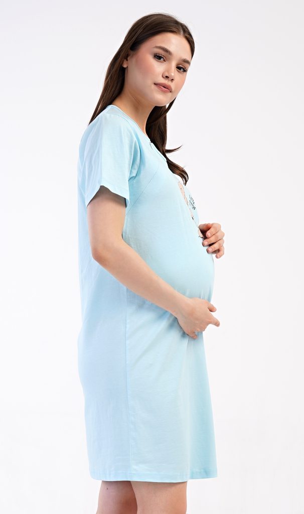 Dámská bavlněná mateřská noční košile Miláček. Noční košile je svým střihem určená na dobu těhotenství, do porodnice i ke kojení. Ke kojení slouží průstřihy po stranách košile, které jsou uzavíratelné na zip. Přední díl košile zdobí obrázek roztomilého medvídka. Použitý materiál s podílem bavlny 100% je příjemný a poddajný na dotek.