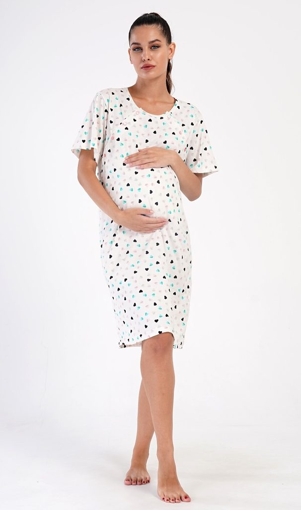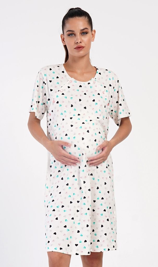 Dámská bavlněná mateřská noční košile Sára. Noční košile je svým střihem určená na dobu těhotenství, do porodnice i ke kojení. Ke kojení slouží průstřihy po stranách košile, které jsou uzavíratelné na knoflíky. Košile je potištěna drobnými srdíčky. Použitý materiál s podílem bavlny 100% je příjemný a poddajný na dotek.