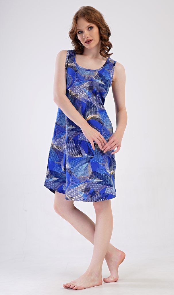 Dámská bavlněná noční košile na ramínka Eliza. Noční košile se širšími ramínky a kulatým výstřihem je potištěna geometrickými vzory. Použitý materiál s obsahem bavlny 100% je příjemný a poddajný na dotek. Košile je vhodná i na denní nošení, obvzlášť v horkých letních dnech.