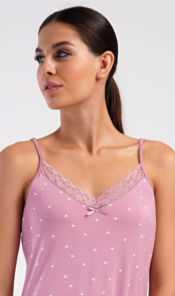Dámská noční košile na ramínka Ingrid. Dámská noční košile se špagetovými ramínky má příjemnou délku nad kolena a ozdobné žlábkování okolo spodního lemu. Výstřih je ozvláštněn jemnou krajkou. Košile je potištěna srdíčky v bílé barvě. Použitý materiál ze směsi viskózy a lycry je příjemný a poddajný na dotek.