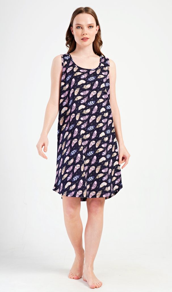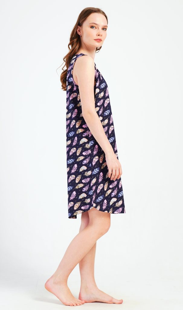 Dámská bavlněná noční košile na ramínka Peříčka. Noční košile se širšími ramínky a kulatým výstřihem je potištěna barevnými pírky. Použitý materiál s obsahem bavlny 100% je příjemný a poddajný na dotek. Košile je vhodná i na denní nošení, obvzlášť v horkých letních dnech.