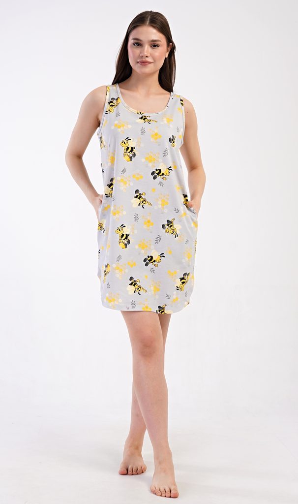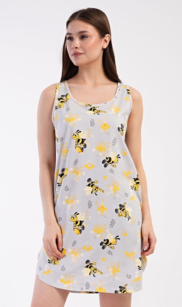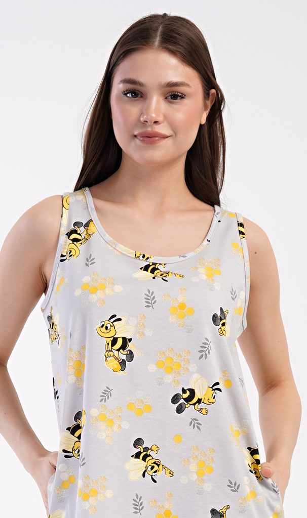 Dámská bavlněná noční košile na ramínka Včelky. Noční košile se širšími ramínky a kulatým výstřihem má praktické kapsy, je potištěna obrázky včelek. Použitý materiál s obsahem bavlny 100% je příjemný a poddajný na dotek. Košile je vhodná i na denní nošení, obvzlášť ji oceníte v horkých letních dnech.