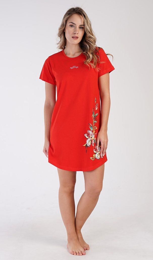 Dámská bavlněná noční košile s krátkým rukávem Alenka. Noční košile s kulatým výstřihem má na hrudi má drobný nápis 'New beginnings' a ve spodní části potisk květů. Použitý materiál s obsahem bavlny 100% je příjemný a poddajný na dotek.