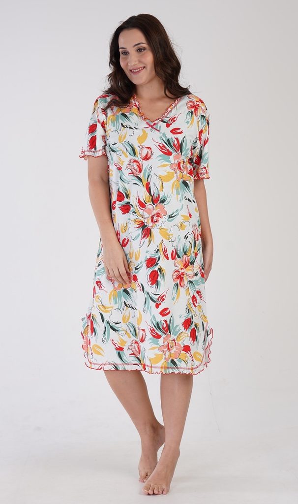 Dámská bavlněná noční košile s krátkým rukávem Alex. Noční košile pro všechny milovníky retra a starých časů s příjemnou délkou pod kolena má ozdobné žlábkování kolem výstřihu, rukávů a spodního lemu. Na látce košile jsou natištěny florální motivy. Použitý bavlněný materiál je příjemný a poddajný na dotek.