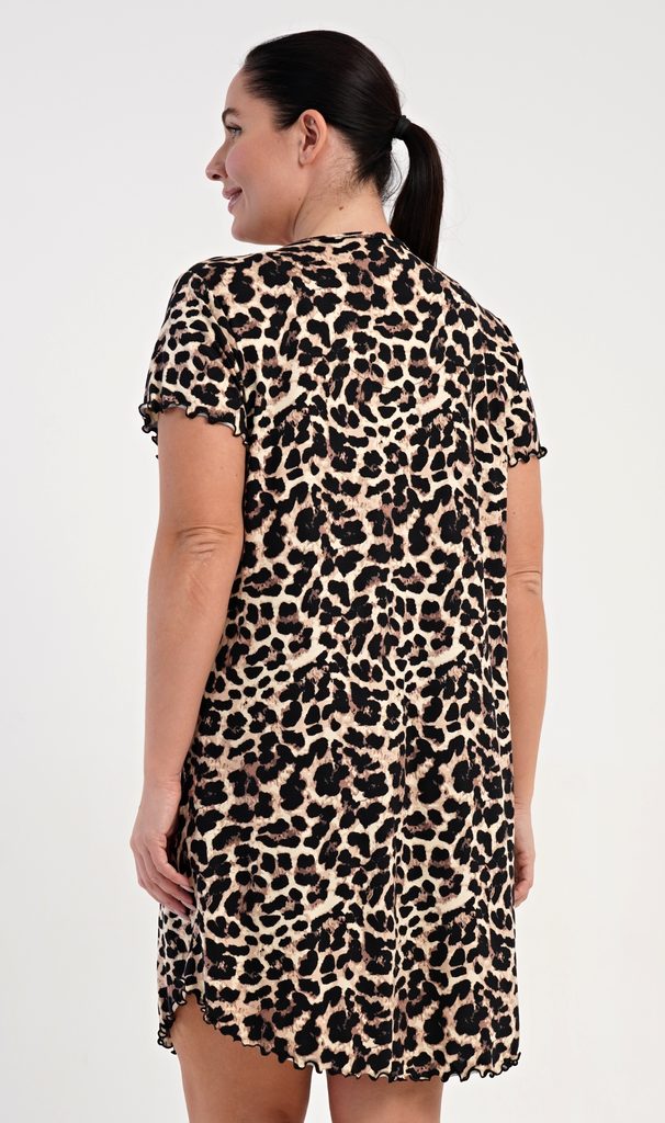 Dámská noční košile s krátkým rukávem Audrey. Noční košile s příjemnou délkou po kolena má žlábkování na rukávech a spodním lemu, výstřih je ozdoben krajkou. Látka košile je potištěna leopardím vzorem. Použitý viskózový materiál s příměsí lycry je příjemný a poddajný na dotek.