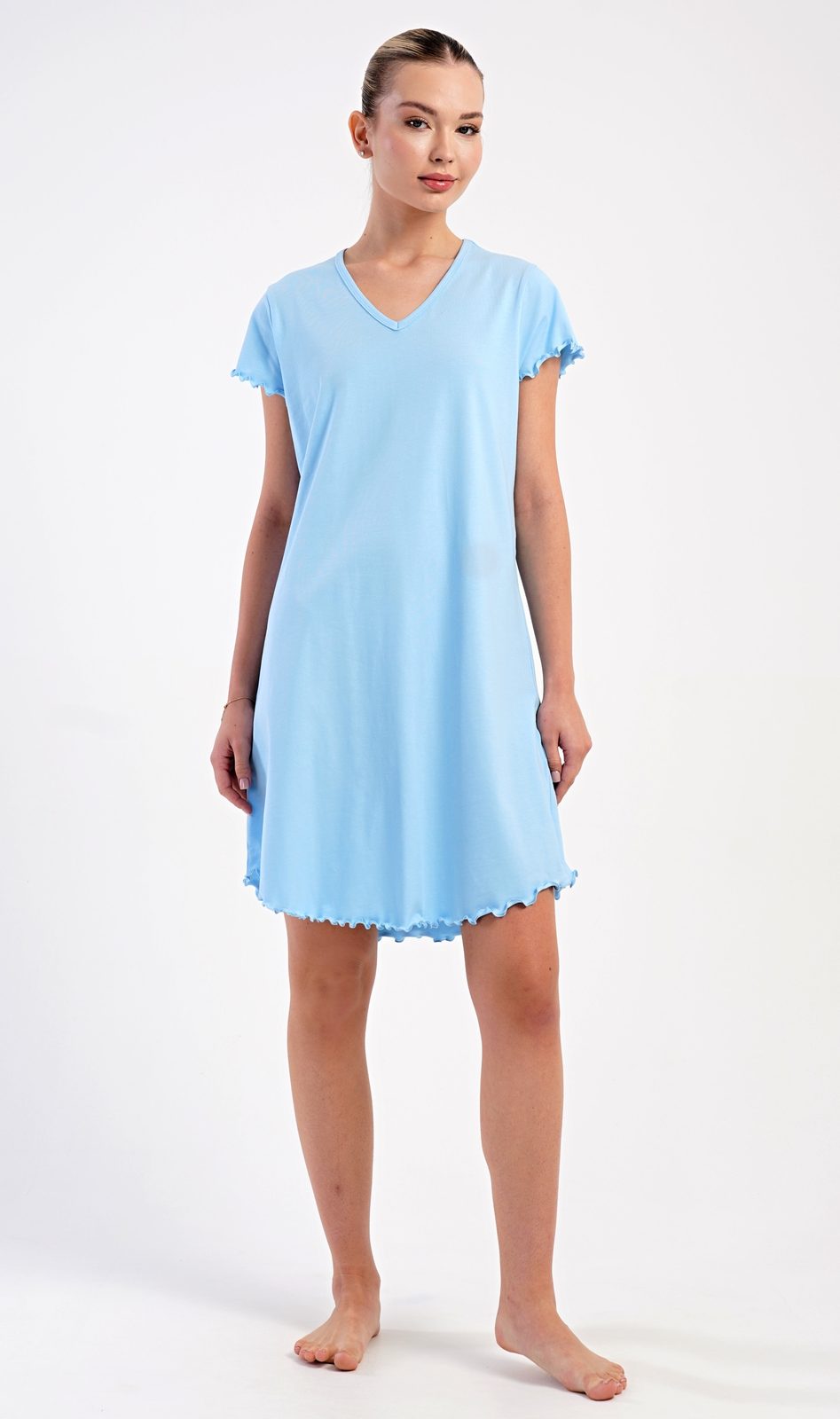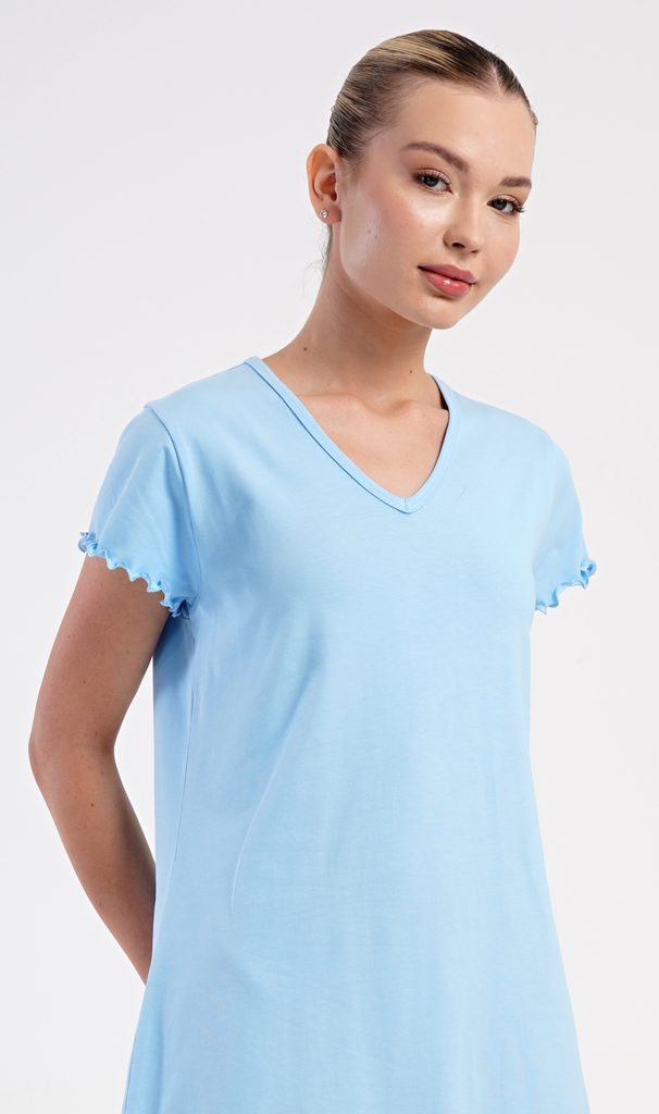 Dámská bavlněná noční košile s krátkým rukávem Sandra. Košile má příjemnou délkou nad kolena a výstřih do V, je ozdobena žlábkováním na rukávech a spodním lemu. Použitý materiál s podílem bavlny 95% je příjemný a poddajný na dotek.