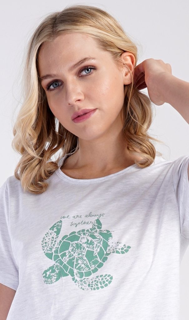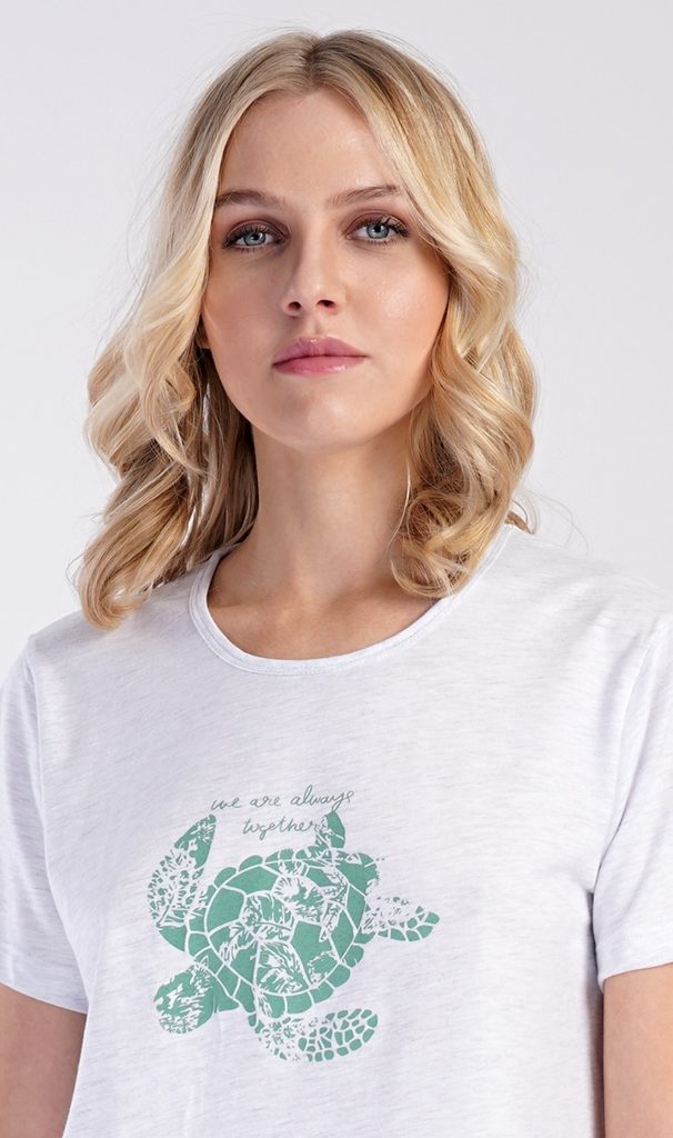 Dámská noční košile s krátkým rukávem Želva. Noční košile s kulatým výstřihem a příjemnou délkou nad kolena má na hrudi obrázek želvy a drobný nápis. Použitý materiál s obsahem bavlny 70% je příjemný a poddajný na dotek.