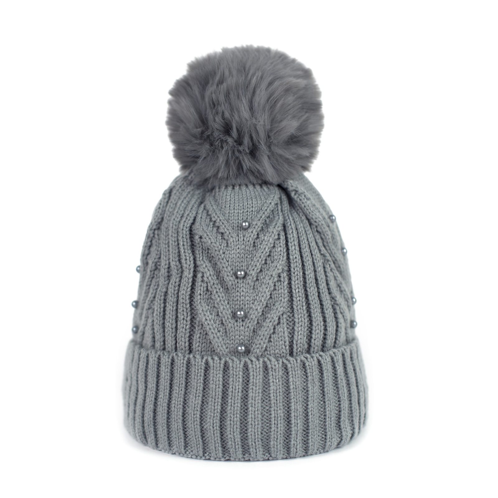 Čepice Dámská módní čepice s bambulí a perličkami šedá