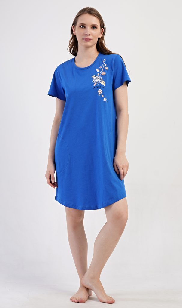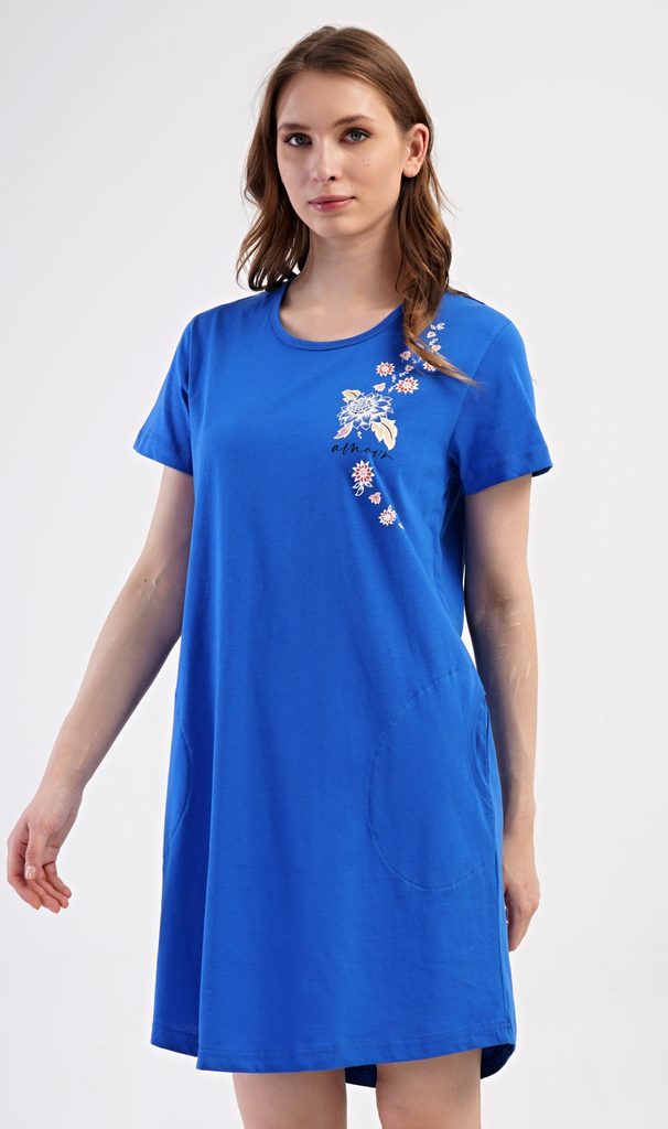 Dámské bavlněné domácí šaty s krátkým rukávem Květy.| Filtr Barva | Modrá |