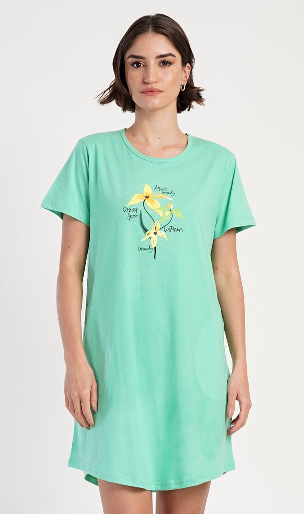 Dámské bavlněné domácí šaty s krátkým rukávem Paula. Domácí šaty s kulatým výstřihem a kapsami zdobí obrázek květů a drobné nápisy. Použitý bavlněný materiál je příjemný a poddajný na dotek. Šaty jsou pohodlné, využijete je téměř při všech volnočasových aktivitách. Šaty jsou vhodné na spaní i na denní nošení.
