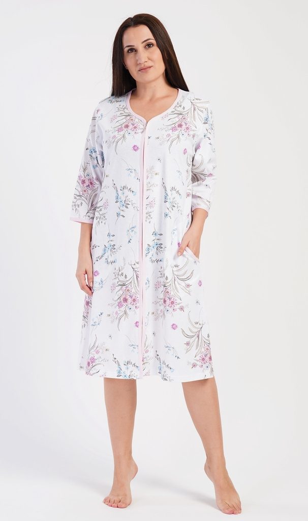 Dámské bavlněné domácí šaty s tříčtvrtečním rukávem Margot. Pohodlné rozepínací šaty v příjemné délce pod kolena využijete téměř při všech volnočasových aktivitách. Mají praktické kapsy a zapínání na zip. Jsou potištěny květy v jemných pastelových tónech, výstřih a rukávy zdobí olemování ve světle lososové barvě. Použitý bavlněný materiál je příjemný a poddajný na dotek.