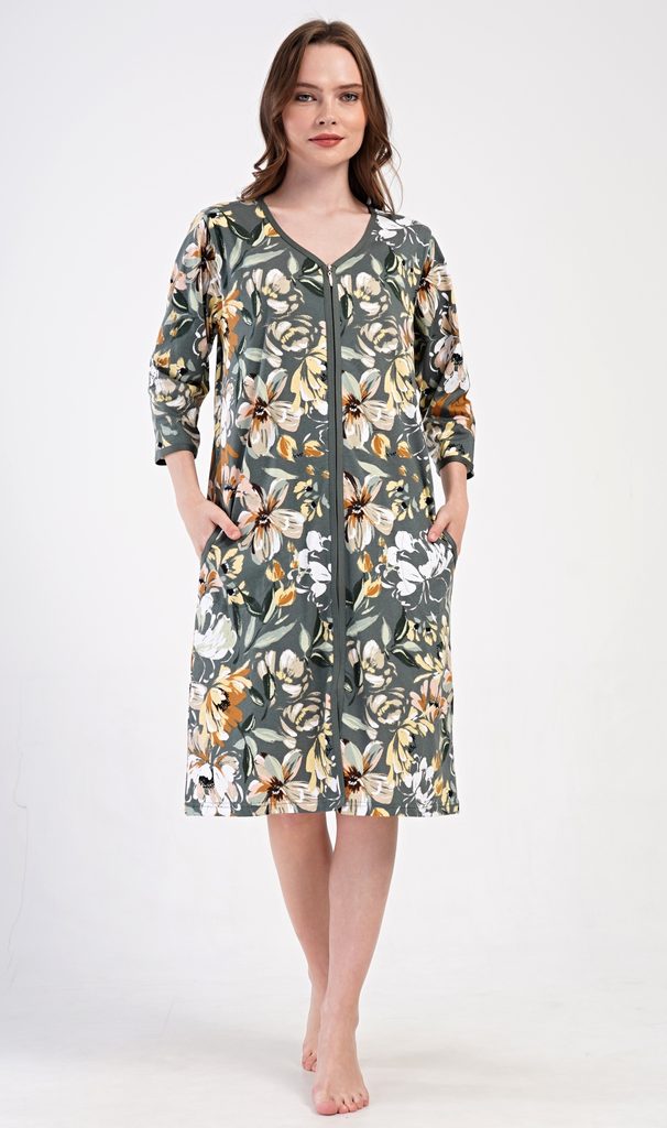 Dámské bavlněné domácí šaty s tříčtvrtečním rukávem Marie. Pohodlné rozepínací šaty v příjemné délce pod kolena využijete téměř při všech volnočasových aktivitách. Mají praktické kapsy a zapínání na zip. Šaty jsou potištěny květy. Použitý bavlněný materiál je příjemný a poddajný na dotek.