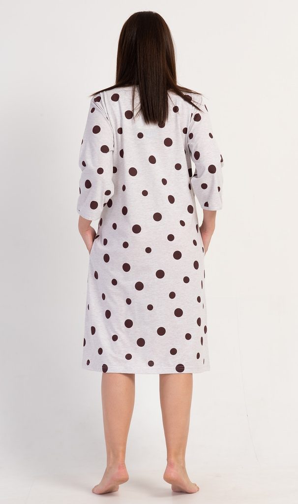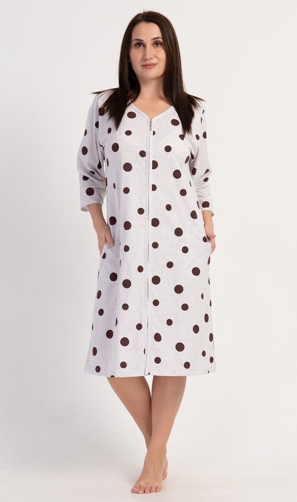 Dámské domácí šaty s tříčtvrtečním rukávem Puntík. Pohodlné rozepínací domácí šaty s decentním potiskem využijete téměř při všech volnočasových aktivitách. Domácí šaty mají praktické kapsy a rozepínání na zip. Použitý materiál s obsahem bavlny 70% je příjemný a poddajný na dotek. Šaty jsou vhodné i na denní nošení.