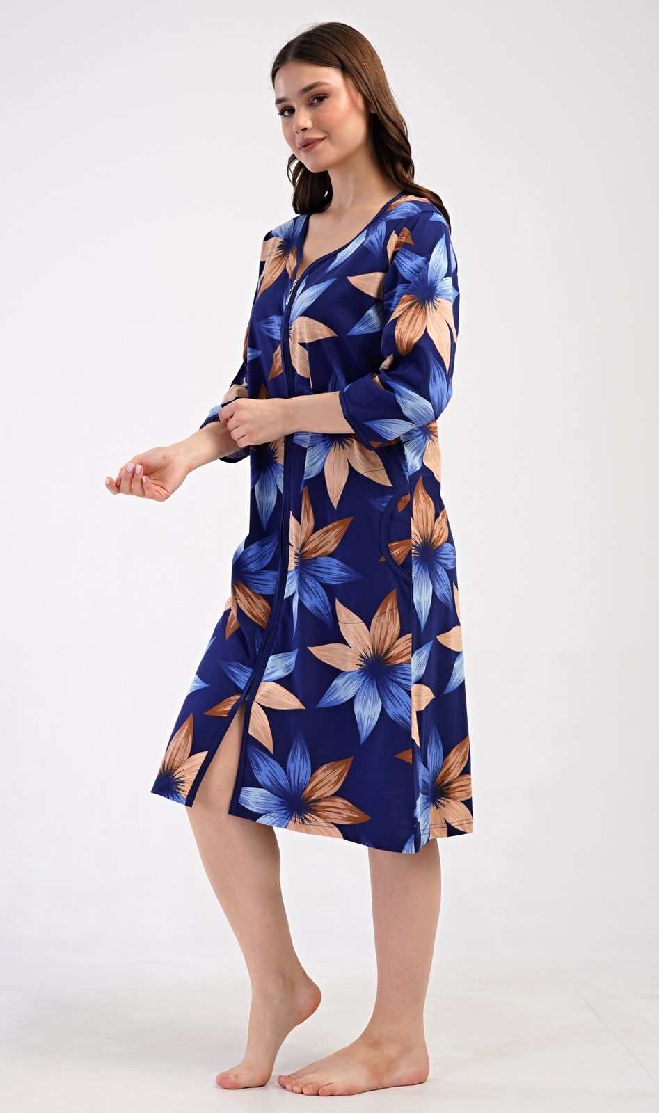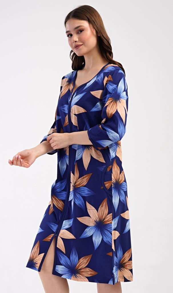 Dámské bavlněné domácí šaty s tříčtvrtečním rukávem Sára. Pohodlné rozepínací šaty v příjemné délce pod kolena využijete téměř při všech volnočasových aktivitách. Mají praktické kapsy a zapínání na zip. Šaty jsou potištěny květy. Použitý bavlněný materiál je příjemný a poddajný na dotek.