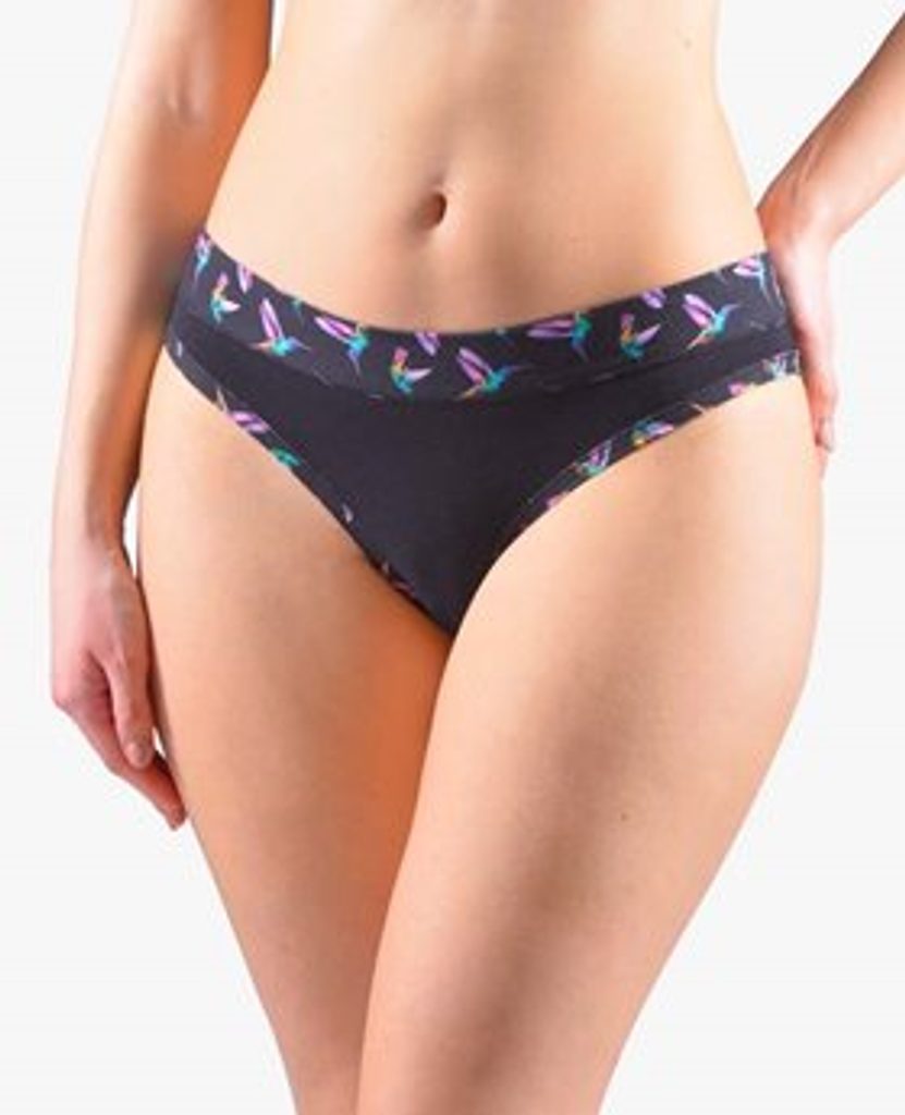 Bokové kalhotky s úzkým bokem, brazilky, a se širokým lemem, dámské šité prádlo. Pasový kraj je začištěný širším lemem ze stejného materiálu. Nohavičky jsou začištěné úzkým lemem ze stejného materiálu. Pasový lem a lemy nohaviček jsou potištěné. Přední a zadní díl jsou jednobarevné.