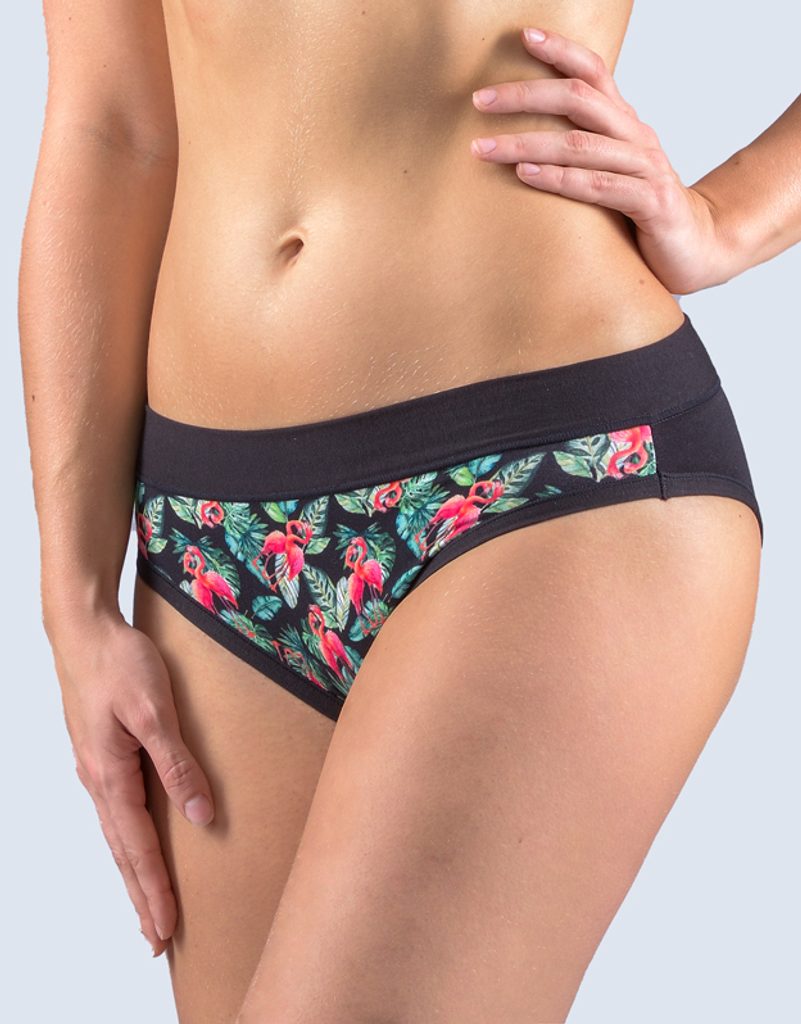 kalhotky bokové, širší bok, šité, s potiskem značky GINA, kód 16168. Složení: 47,5% Viskóza ( Bambus ) 47,5% Bavlna 5% Elastan