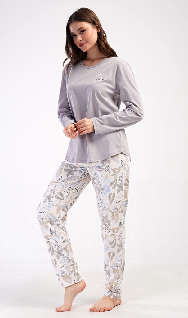Dámské bavlněné dlouhé pyžamo Alex. Dámské pyžamo se skládá z trika s dlouhým rukávem a dlouhých kalhot. Triko je jednobarevné, zdobené na hrudi drobným obrázkem listu. Motiv listů se opakuje i na kalhotách, které mají v pase gumu a šňůrku na stažení, nemají kapsy. Použitý bavlněný materiál je poddajný a příjemný na dotek.