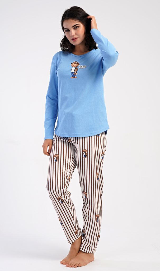 Dámské bavlněné dlouhé pyžamo Bear. Dámské pyžamo se skládá z trika s dlouhým rukávem a dlouhých kalhot. Jednobarevné triko je ozdobeno obrázkem medvěda. Tento motiv se opakuje i na proužkovaných kalhotách, které mají v pase gumu a šňůrku na stažení, nemají kapsy. Použitý bavlněný materiál je poddajný a příjemný na dotek.