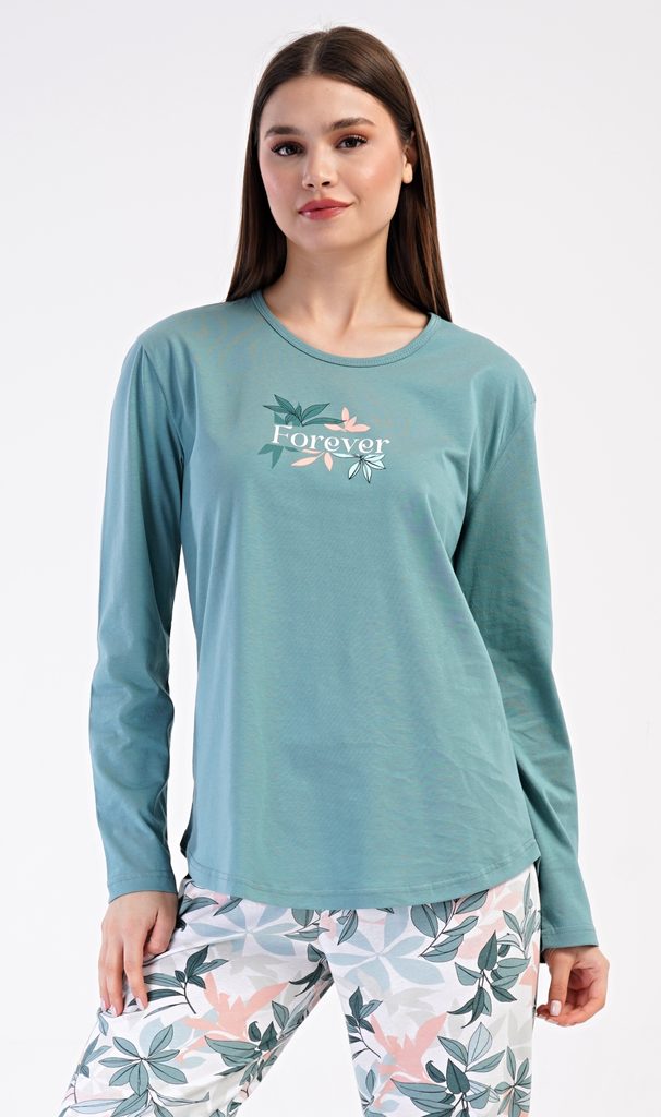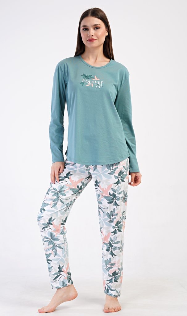 Dámské bavlněné dlouhé pyžamo Melinda. Dámské pyžamo se skládá z trika s dlouhým rukávem a dlouhých kalhot. Triko je jednobarevné, zdobené na hrudi drobným obrázkem větviček a nápis 'Forever'. Motiv větviček se opakuje i na kalhotách, které mají v pase gumu a šňůrku na stažení, nemají kapsy. Použitý bavlněný materiál je poddajný a příjemný na dotek.