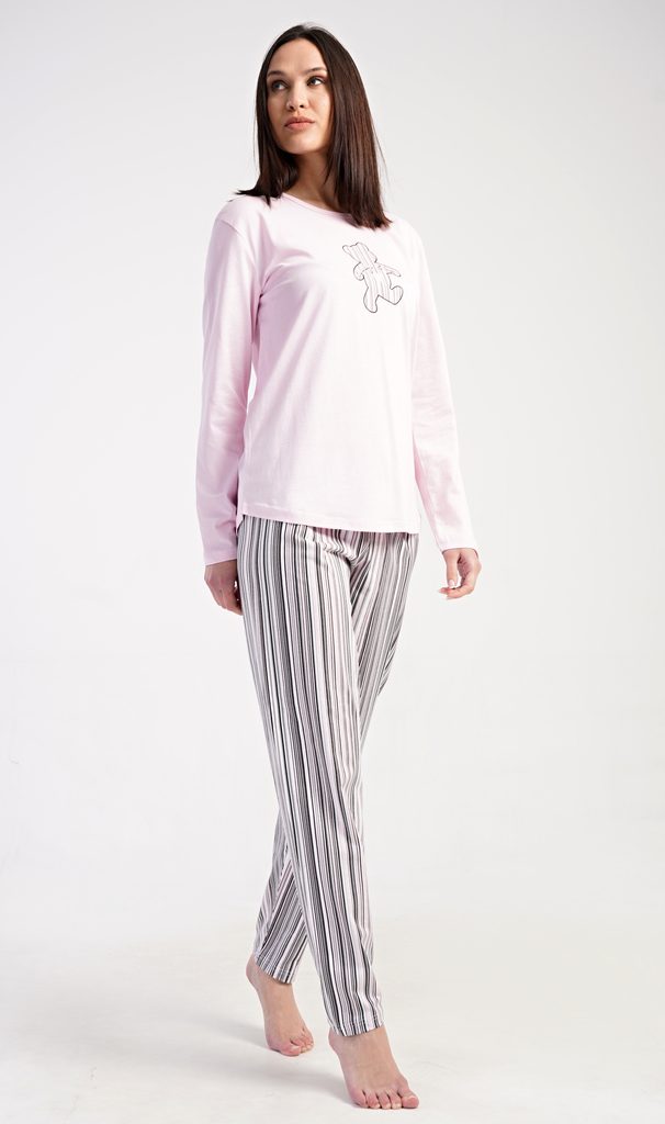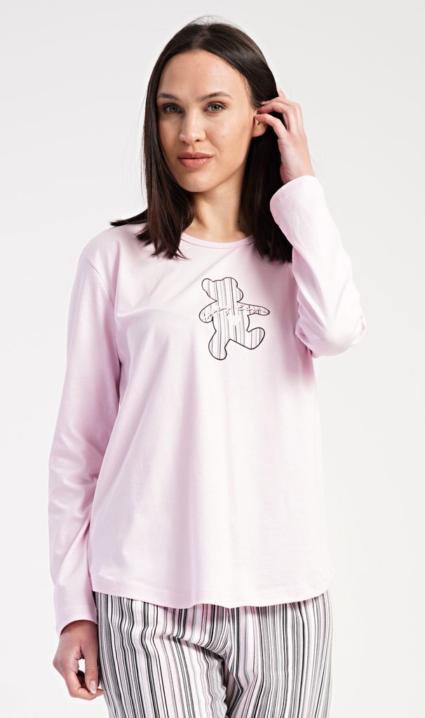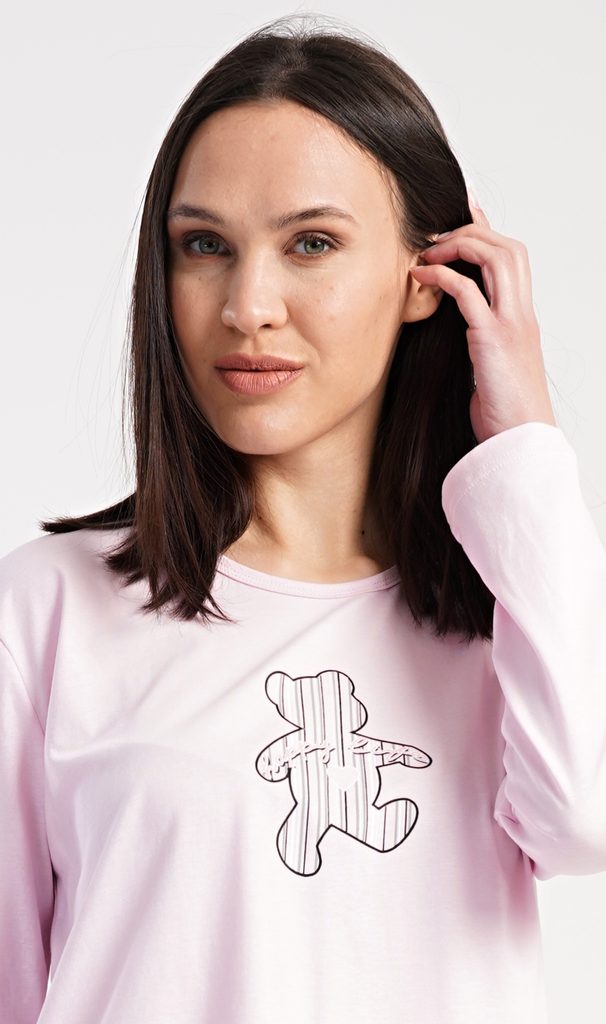 Dámské bavlněné dlouhé pyžamo Paulína. Dámské pyžamo se skládá z trika s dlouhým rukávem a dlouhých kalhot. Triko je jednobarevné, zdobené na hrudi obrázkem medvídka. Proužkované kalhoty mají v pase gumu a šňůrku na stažení, nemají kapsy. Použitý bavlněný materiál je poddajný a příjemný na dotek.