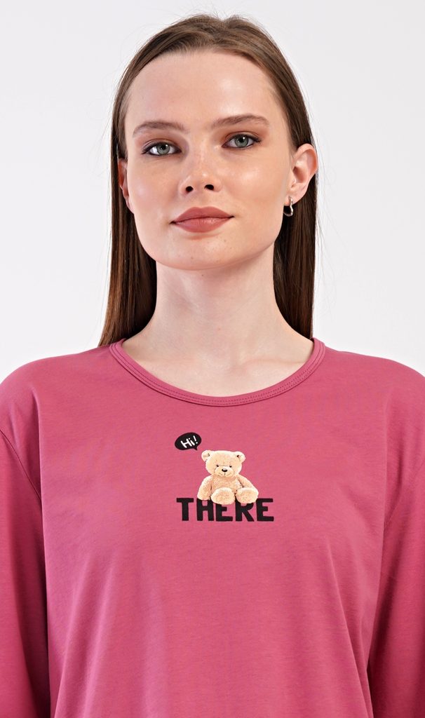 Dámské bavlněné dlouhé pyžamo Pink bear. Dámské pyžamo se skládá z trika s dlouhým rukávem a dlouhých kalhot. Triko je jednobarevné, zdobené obrázkem plyšového medvěda a nápisem THERE. Obrázky medvídků se opakují i na kalhotách, které mají v pase gumu a šňůrku na stažení, nemají kapsy. Použitý bavlněný materiál je poddajný a příjemný na dotek.