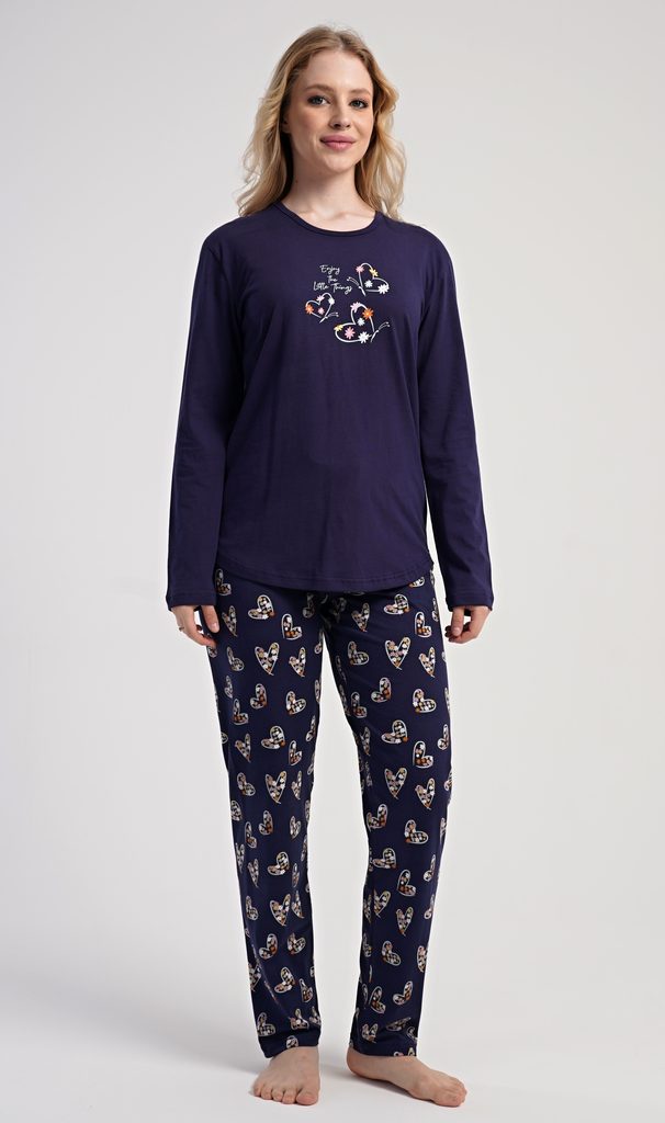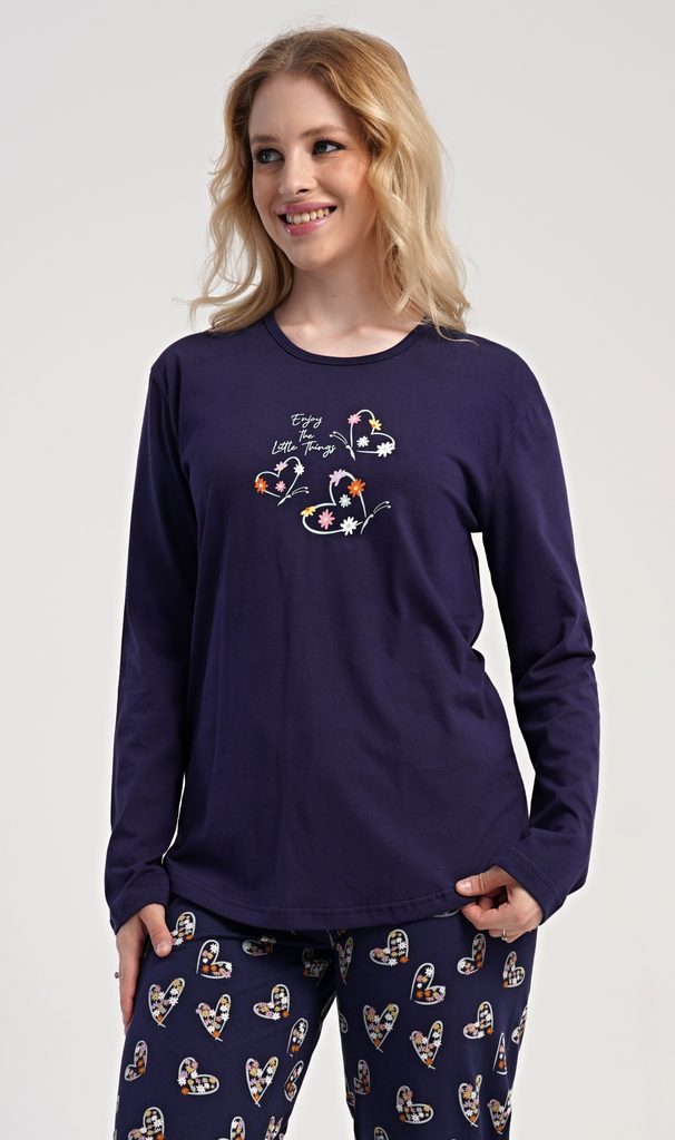 Dámské bavlněné dlouhé pyžamo Sarah. Dámské pyžamo se skládá z trika s dlouhým rukávem a dlouhých kalhot. Jednobarevné triko je ozdobeno obrázkem květů a motýlů. Květinový motiv se opakuje i na kalhotách, které mají v pase gumu a šňůrku na stažení, nemají kapsy. Použitý bavlněný materiál je poddajný a příjemný na dotek.