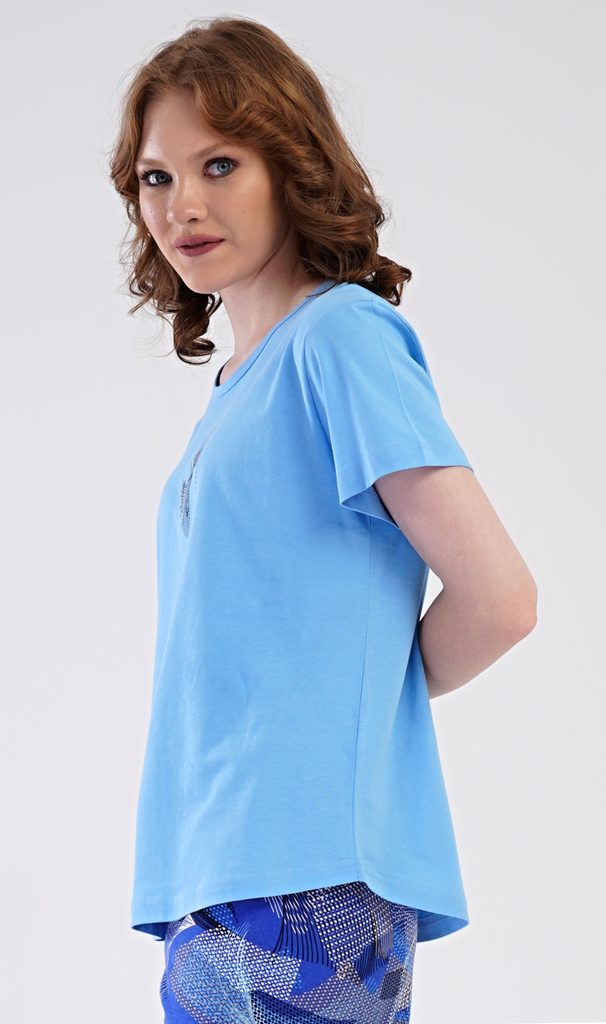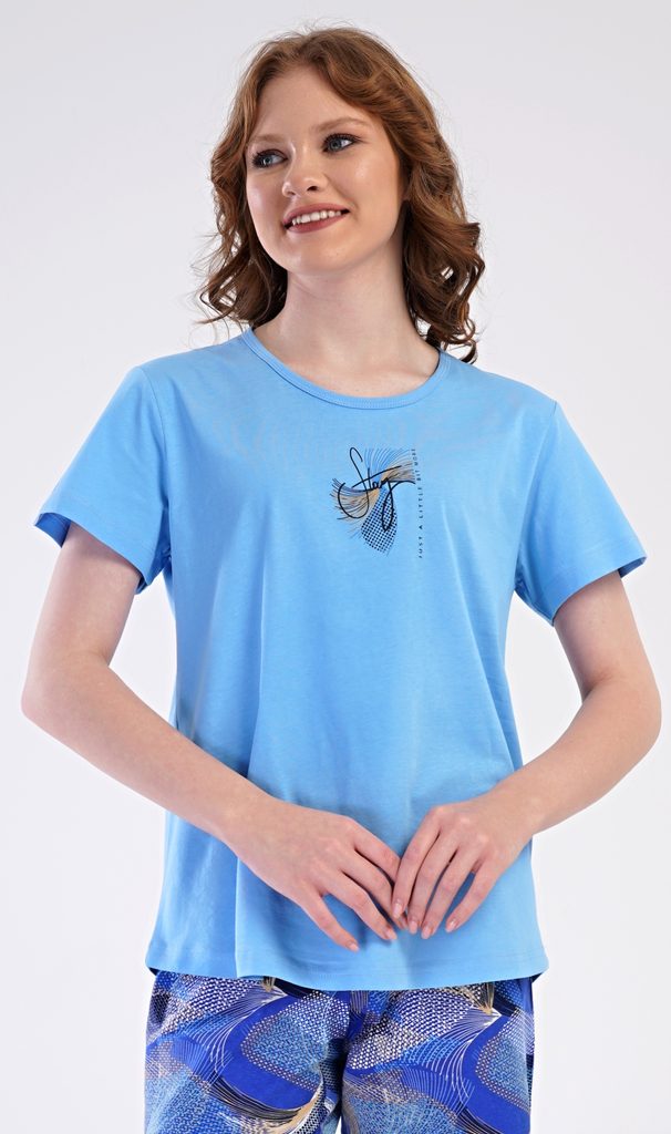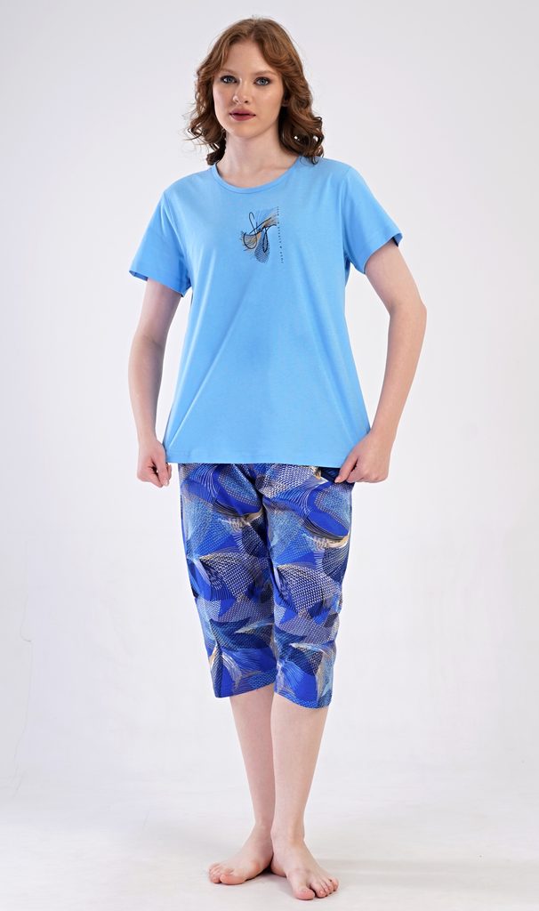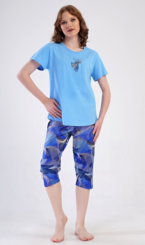 Dámské bavlněné kapri pyžamo Eliza. Dámské pyžamo se skládá z trička s krátkým rukávem a tříčtvrtečních kalhot. Tričko s kulatým výstřihem má na hrudi obrázek s geometrickým vzorem. Tento motiv se opakuje i na kalhotách, které mají v pase gumu a šňůrku na stažení, jsou bez kapes. Použitý bavlněný materiál je příjemný a poddajný na dotek.