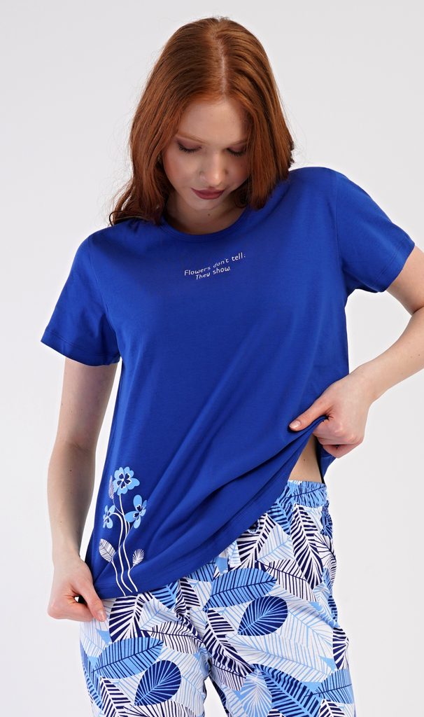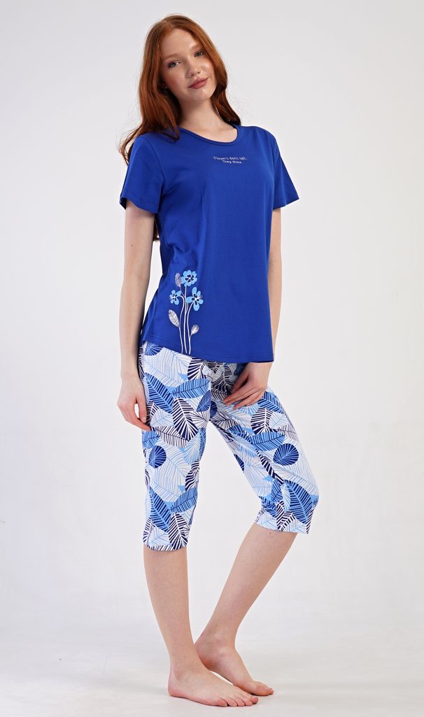 Dámské bavlněné kapri pyžamo Julie. Dámské pyžamo se skládá z trička s krátkým rukávem a tříčtvrtečních kalhot. Tričko s kulatým výstřihem zdobí ve spodní části obrázek květů. Kalhoty s potiskem listů mají v pase gumu a šňůrku na stažení, jsou bez kapes. Použitý bavlněný materiál je příjemný a poddajný na dotek.