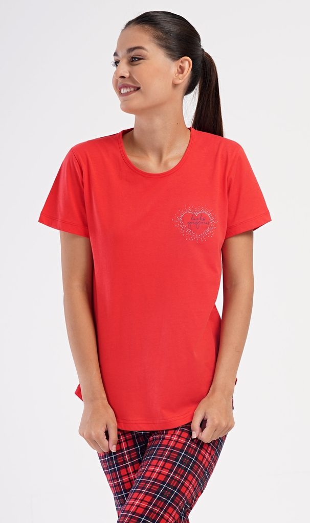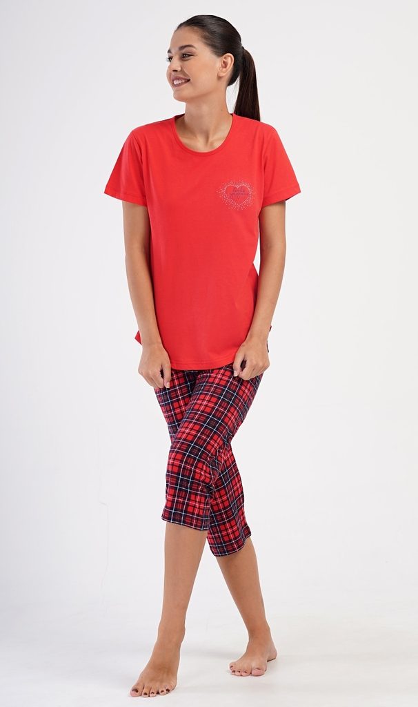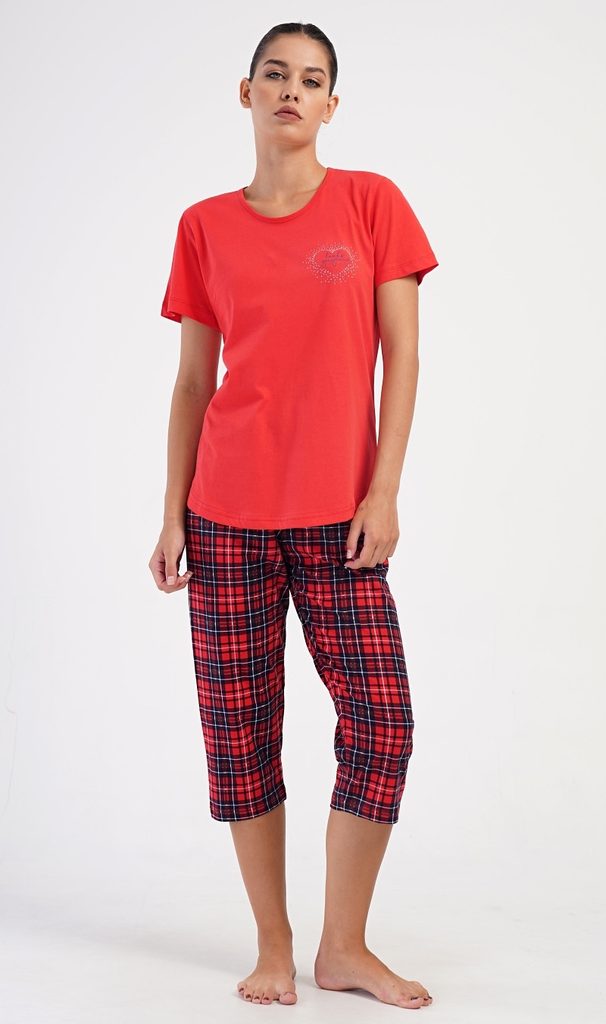 Dámské bavlněné kapri pyžamo Kateřina. Dámské pyžamo se skládá z trička s krátkým rukávem a tříčtvrtečních kalhot. Tričko s kulatým výstřihem má na hrudi obrázek srdíčka a nápis 'Looks gorgeous'. Kárované kalhoty mají v pase gumu a šňůrku na stažení, jsou bez kapes. Použitý bavlněný materiál je příjemný a poddajný na dotek.