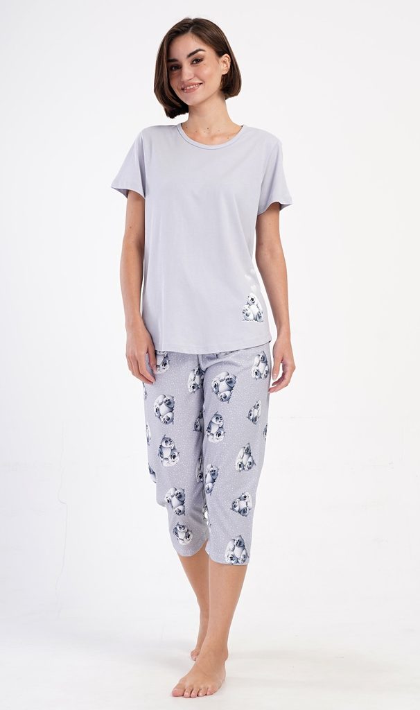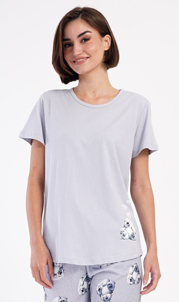 Dámské bavlněné kapri pyžamo Polar bear. Dámské pyžamo se skládá z trička s krátkým rukávem a tříčtvrtečních kalhot. Tričko s kulatým výstřihem zdobí obrázek ledního medvěda. Tento motiv se opakuje i na tříčtvrtečních kalhotách, které mají v pase gumu a šňůrku na stažení, jsou bez kapes. Použitý bavlněný materiál je příjemný a poddajný na dotek.