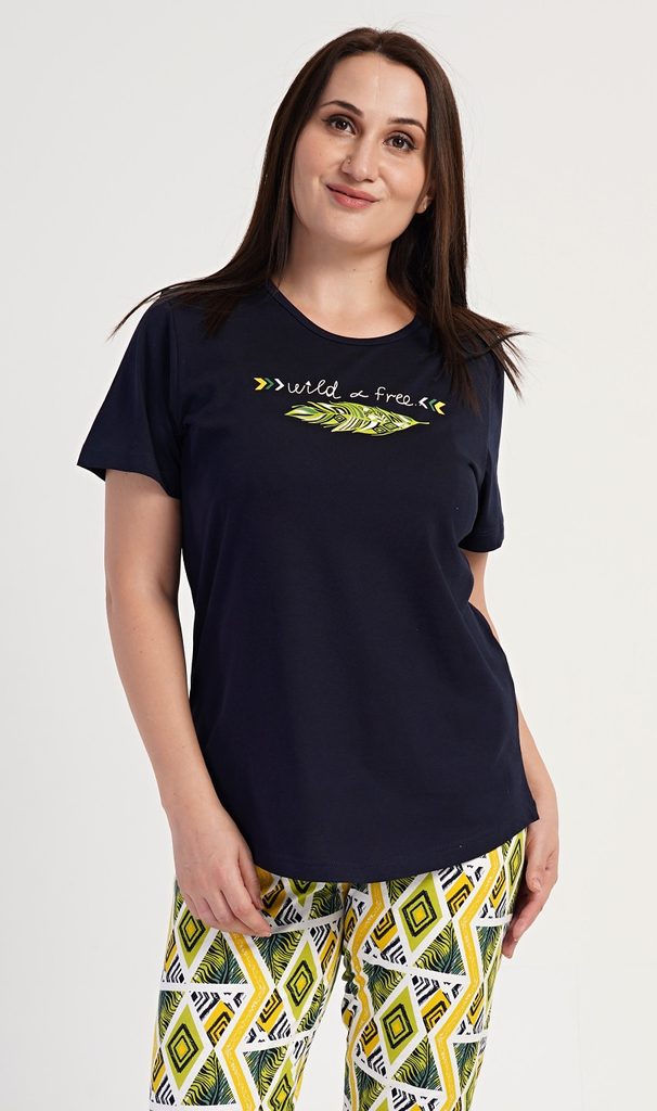 Dámské bavlněné kapri pyžamo Zuzka. Kapri pyžamo se skládá z trička s krátkým rukávem a tříčtvrtečních kalhot. Tričko s kulatým výstřihem má na hrudi obrázek peříčka a nápis 'Wild and free', kalhoty jsou potištěny pestrým vzorem v brazilském stylu. Kapri kalhoty mají v pase gumu a šňůrku na stáhnutí, nemají kapsy. Použitý materiál je příjemný a poddajný na dotek. Obsah bavlny u trička i u kalhot je 100%.
