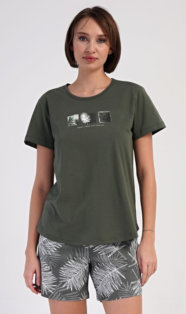 Dámské bavlněné pyžamo šortky Barbora. Dámské pyžamo se skládá z trička s krátkým rukávem a šortkových kalhot. Na jednobarevném tričku jsou obrázky palmových listů. Stejný motiv se opakuje i na šortkách, které mají v pase gumu a šňůrku na stáhnutí, jsou bez kapes. Použitý bavlněný materiál je příjemný a poddajný na dotek.