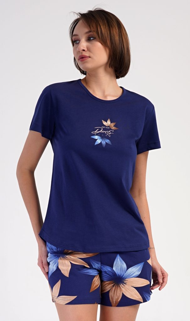 Dámské bavlněné šortkové pyžamo Sára. Dámské pyžamo se skládá z trička s krátkým rukávem a šortkových kalhot. Jednobarevné tričko zdobí obrázek květu. Květinový motiv se opakuje i na šortkách, které mají v pase gumu a šňůrku na stáhnutí, jsou bez kapes. Použitý bavlněný materiál je příjemný a poddajný na dotek.