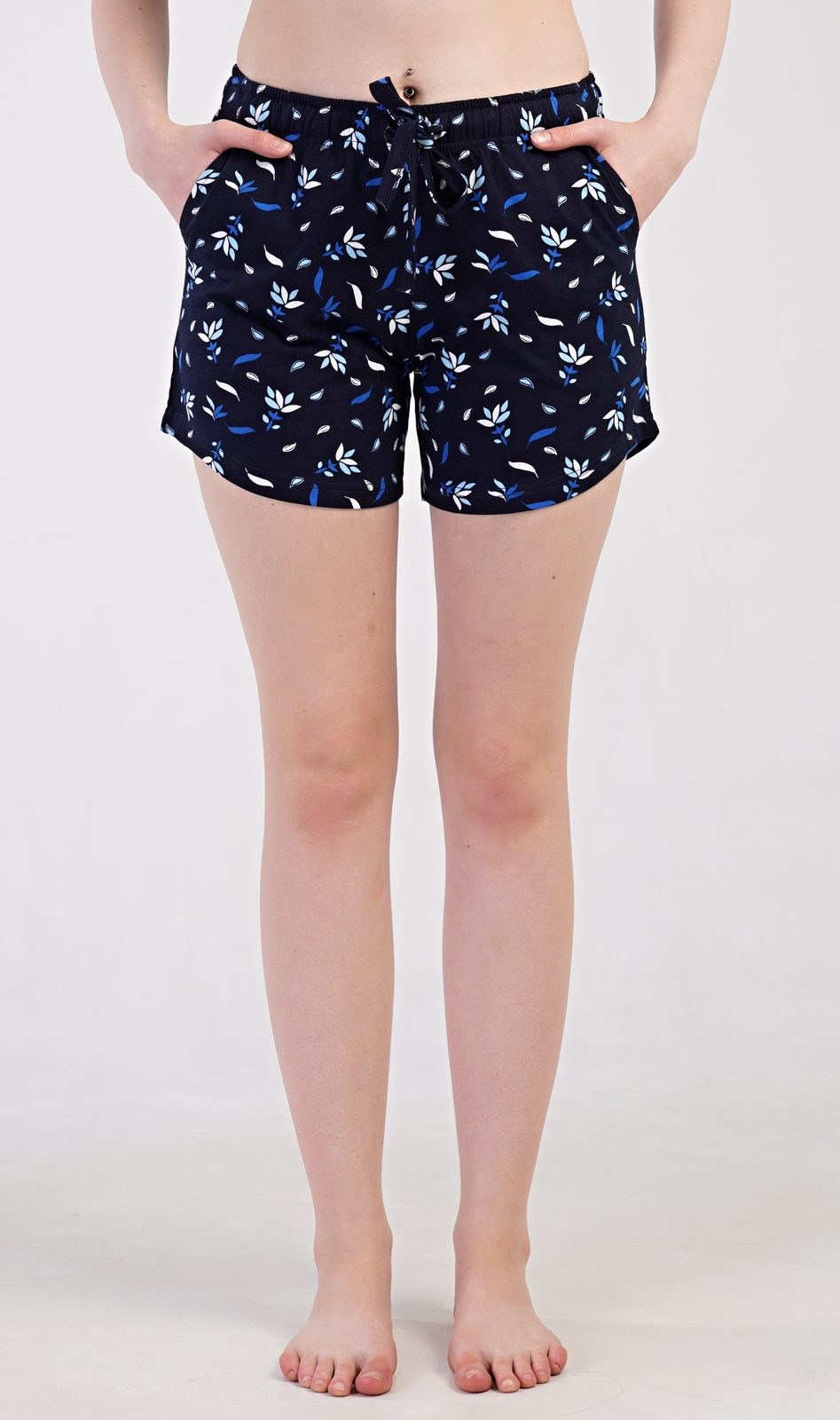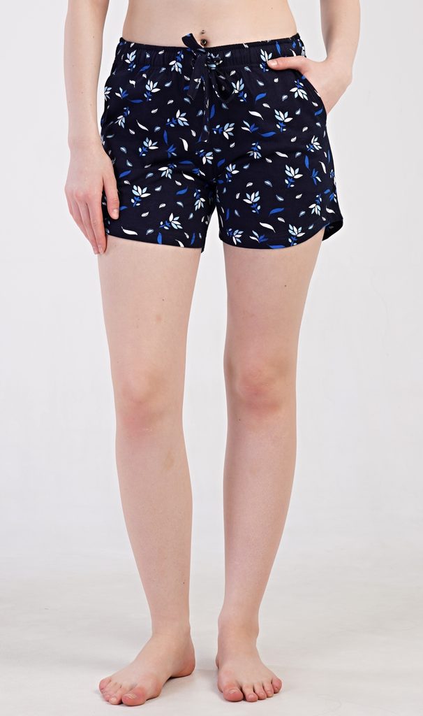 Dámské bavlněné pyžamové šortky Listy. Pyžamové krátké kalhoty jsou zdobeny potiskem listů. Mají v pase gumu, šňůrku na stažení a praktické kapsy. Použitý bavlněný materiál je příjemný a poddajný na dotek.
