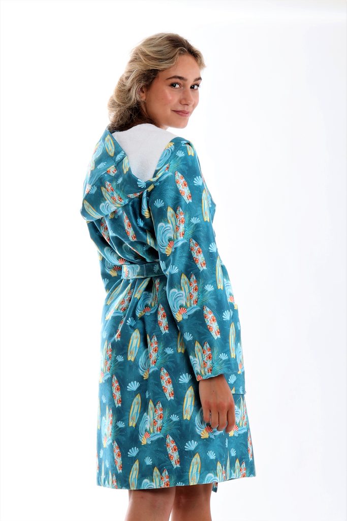 Vnitřní strana županu je vyrobena z bambusového froté, což nabízí výbornou absorpci a měkkost. Vnější strana má hladký povrch z mikrovlákna s digitálním potiskem, který evokuje surfařskou atmosféru.