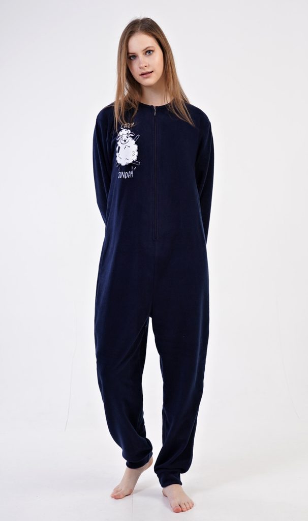 Dámský polarový overal Ovečka. Dámský overal na zip s našitou aplikací s motivem veselé ovečky. Na tmavě modrém podkladu je vyšitý nápis Lazy sunday. Použitý materiál je hřejivý a poddajný na dotek.