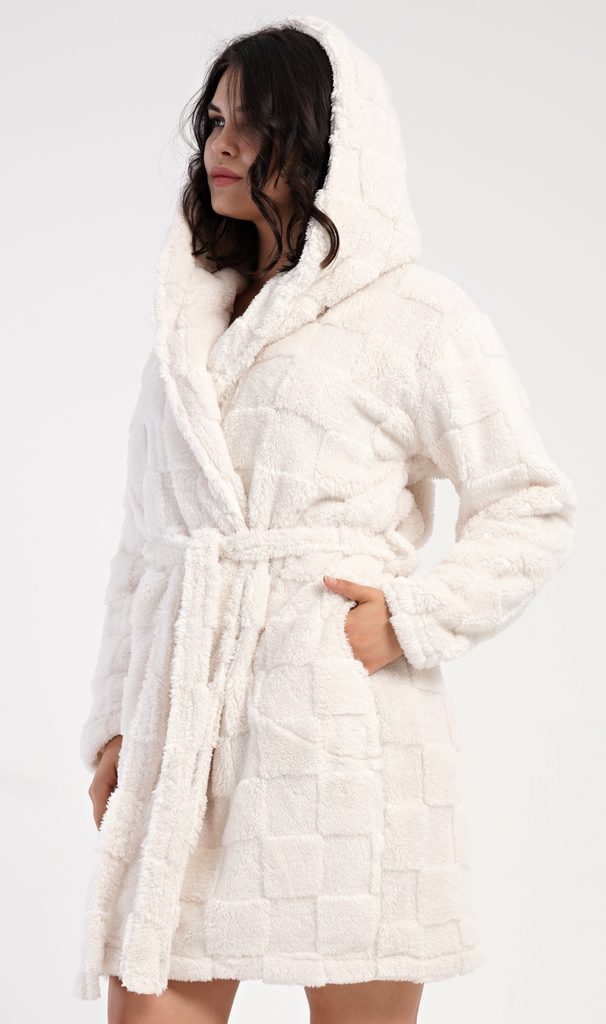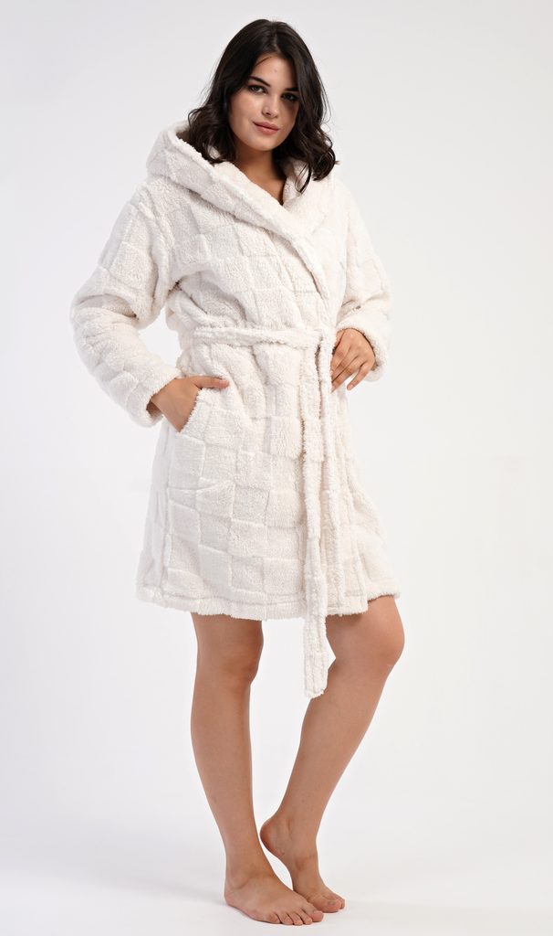Dámský krátký softový župan s kapucí Karolína. Župan má kapuci, praktické kapsy a pásek ke stažení. Je zdobený jemnou kostkou. Župan Vás zahřeje cestou z koupelny i při lenošení na gauči, bude to Váš milý společník v chladných dnech. Použitý softový materiál je jemný a poddajný na dotek.