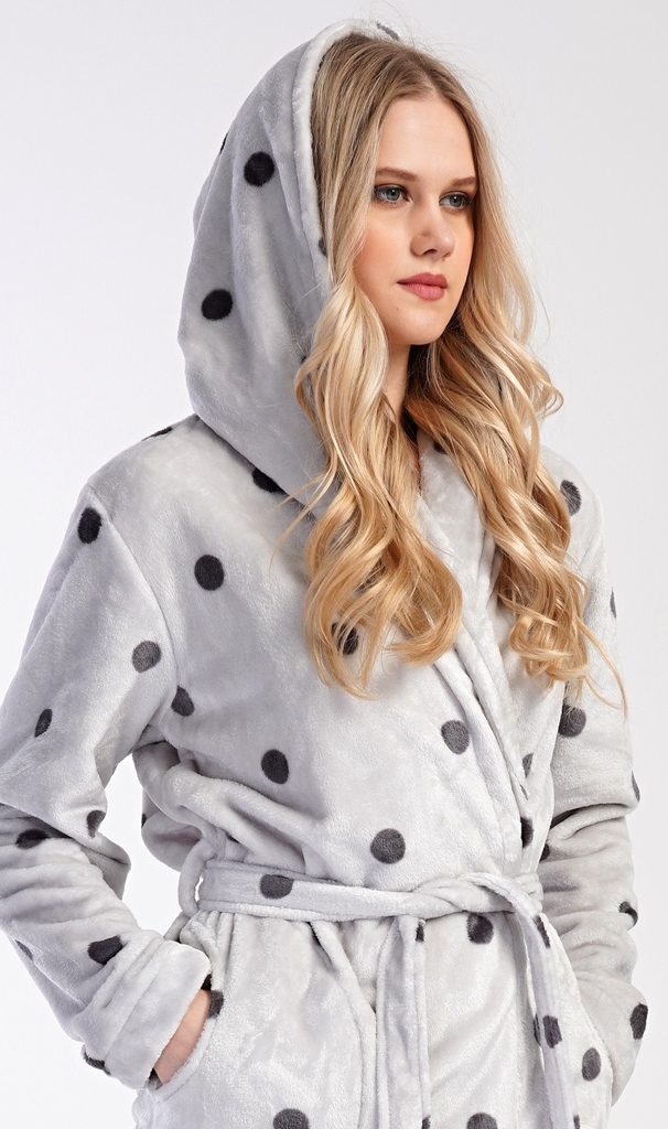 Dámský krátký softový župan s kapucí Puntík. Župan má kapuci, kapsy a pásek k převázání. Světle šedý podklad je zdobený tmavě šedými kuličkami. Použitý softový materiál je jemný a poddajný na dotek. Župan Vás zahřeje cestou z koupelny i při lenošení na gauči, bude to Váš milý společník v chladných dnech.