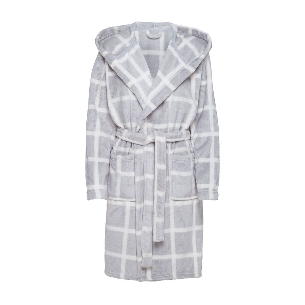 Dámský župan se vzorem kostky má stylovou bílo-šedou barvu a hebký materiál. Župan je vyrobený z hebkého mikroplyše se vzorem. Má kapuci a je s kapsami. Má zavinovací střih a pásek.