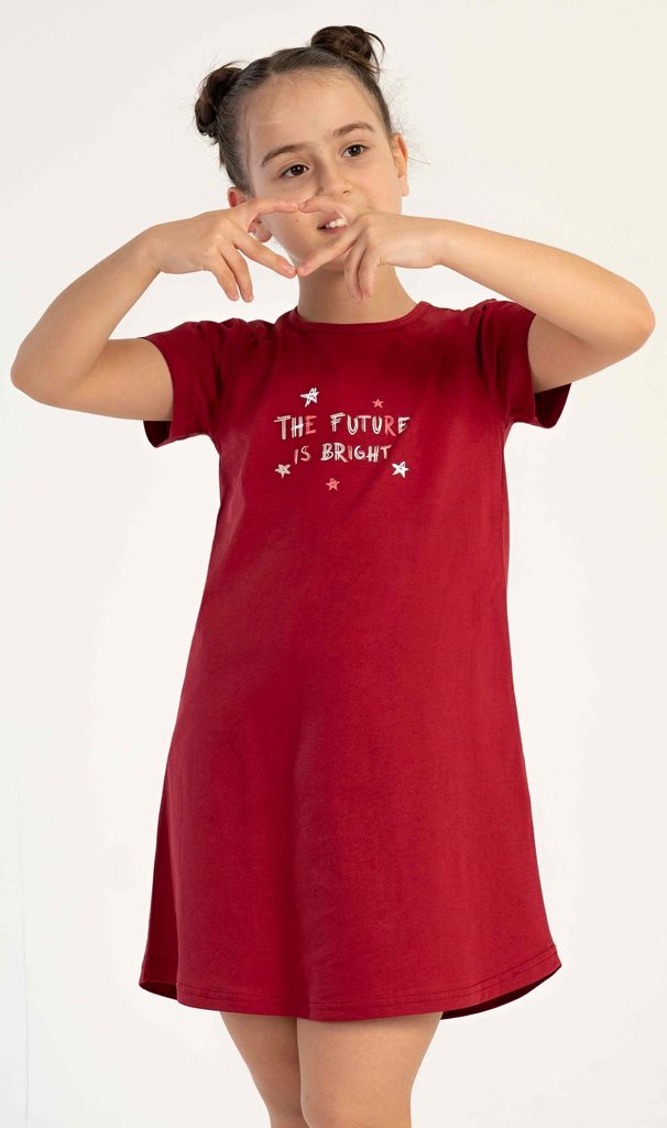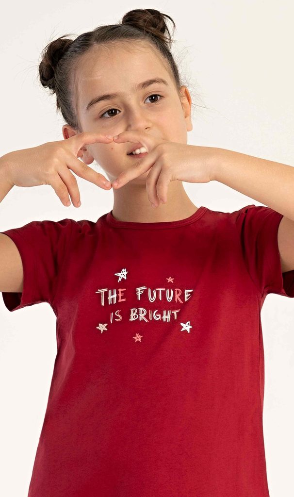 Dětská bavlněná noční košile s krátkým rukávem Hvězdičky. Na jednobarevné košilce s krátkým rukávem je obrázek hvězdiček a nápis 'The future is bright'. Použitý bavlněný materiál je poddajný a příjemný na dotek.