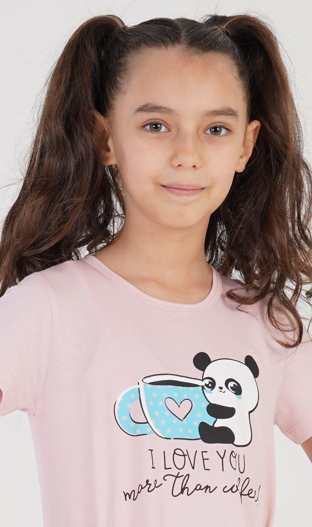 Dětská noční košile s krátkým rukávem Panda. Na jednobarevné košilce s krátkým rukávem je obrátek medvídka pandy s hrníčkem a nápis I LOVE YOU. Použitý materiál je poddajný a jemný na dotek.