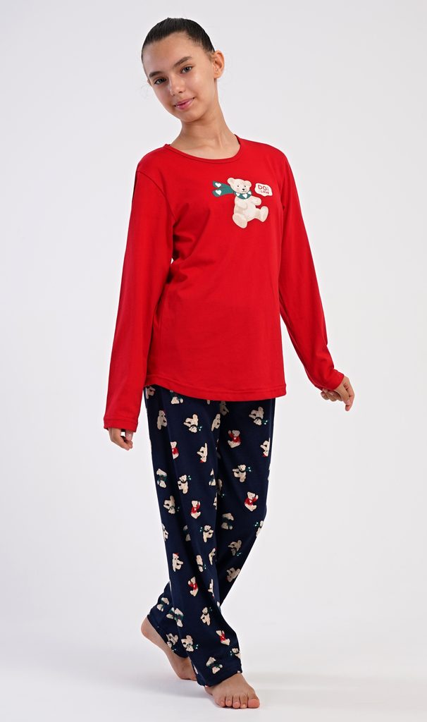 Dětské bavlněné dlouhé pyžamo Méďa se šálou. Dívčí pyžamo se skládá z trika s dlouhým rukávem a dlouhých kalhot. Triko s kulatým výstřihem je ozdobeno obrázkem plyšového medvěda. Tento motiv se opakuje i na kalhotách, které mají v pase gumu a šňůrku na stažení, nemají kapsy. Použitý bavlněný materiál je poddajný a příjemný na dotek.
