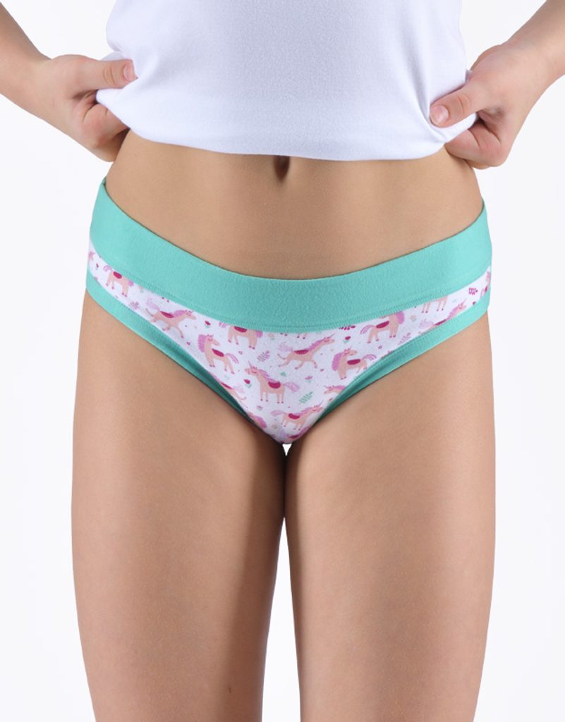Kalhotky klasického střihu se širším pasovým lemem, dívčí šité prádlo. Pasový kraj je začištěný širším lemem ze stejného materiálu. Nohavičky jsou začištěné úzkým lemem ze stejného materiálu. Přední díl je potištěný. Zadní díl a lemy jsou jednobarevné.